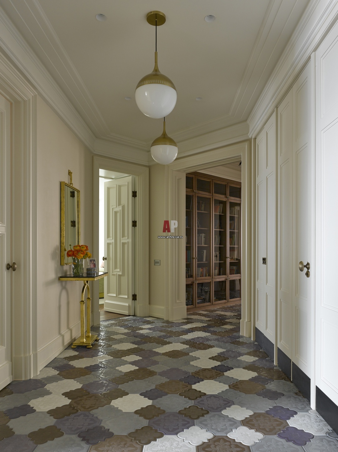 Неудачно расположенный вход в квартиру вынудил архитекторов сделать анфилады из двух холлов, которые выложили разноцветной бетонной плиткой. Двери, лепной гипсовый декор, на заказ. Круглые светильники, Jonathan Adler.