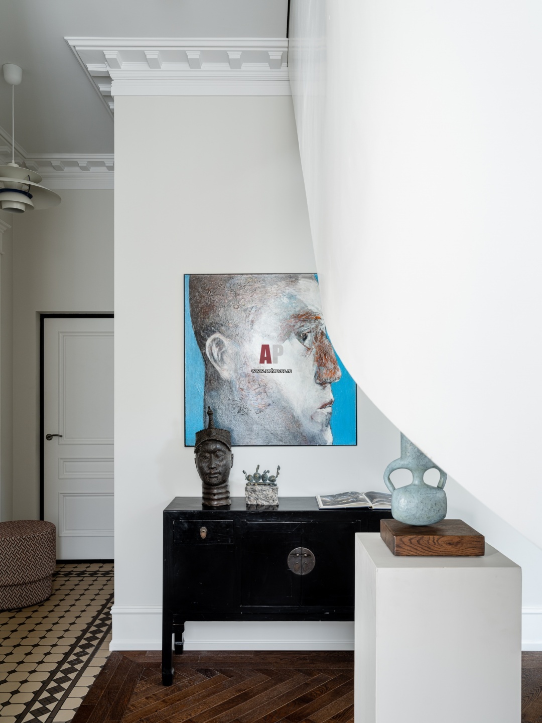 Эклектичная квартира с модернисткой лестницей и элементами неоклассики