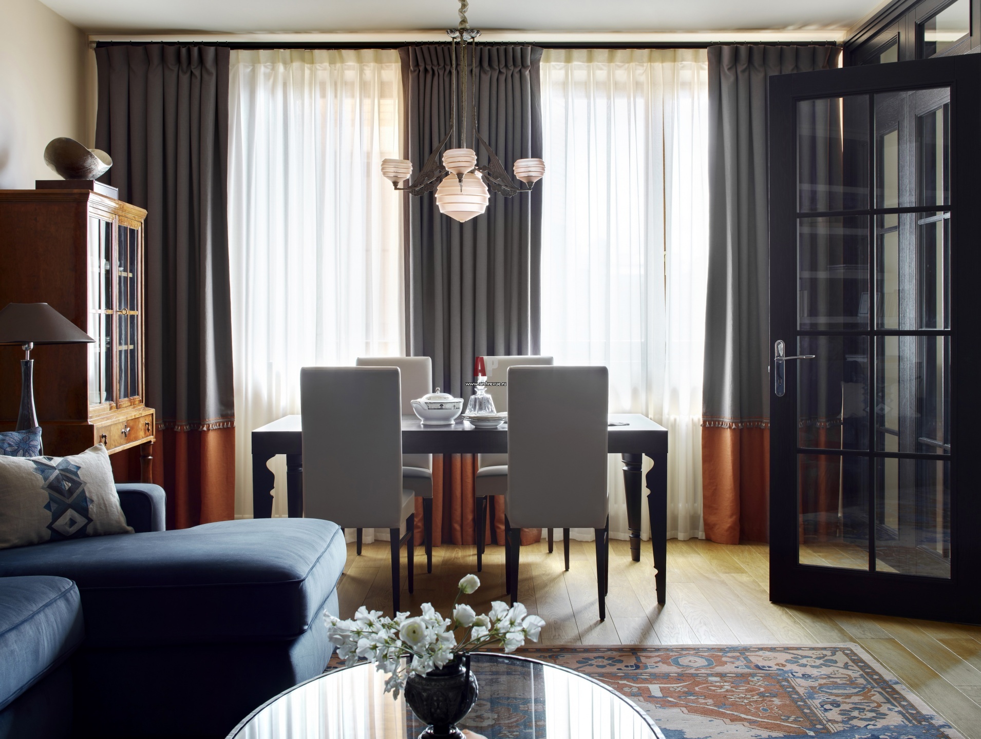Московская квартира с историческими мотивами и антиквариатом. Интерьер столовой. Обеденный стол, DG Home. Стулья, Selva. Буфет, винтаж, Швеция.