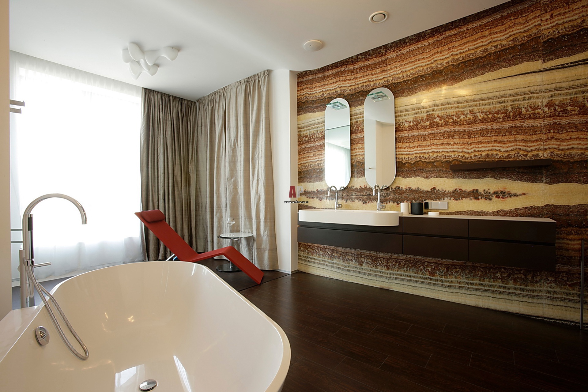 Фрагмент хозяйского санузла. Одна из стен облицована панно из слэбов оникса. Сантехника, Antonio Lupi.