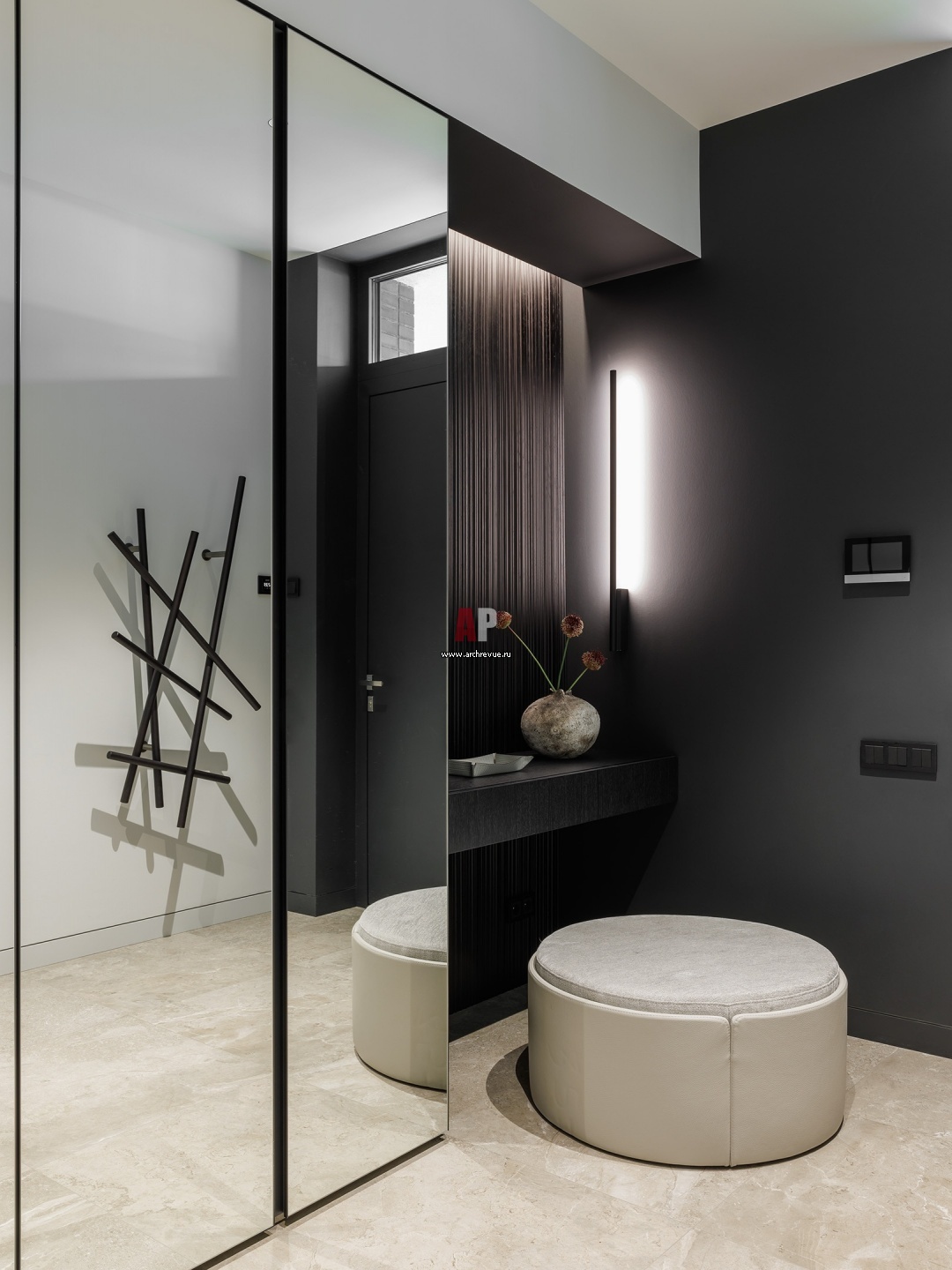 Монохромный дом на природе. Прихожая оформлена в темной гамме. Вешалка, Porada.