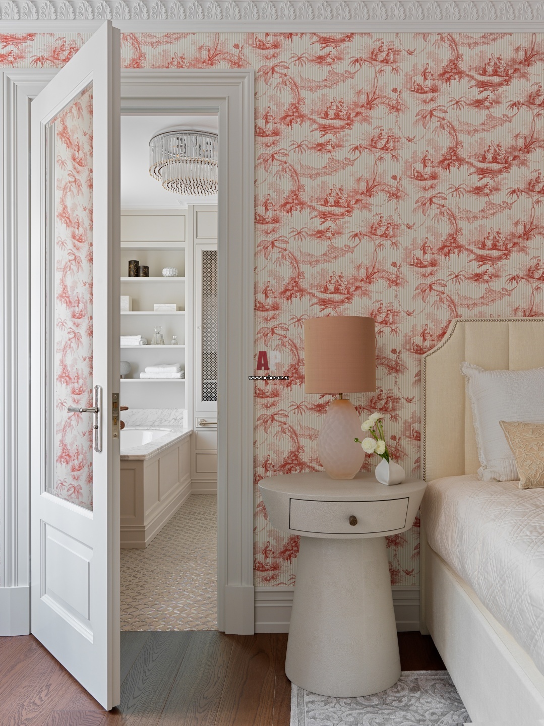 Спальня со смежной ванной комнатой. Прикроватный столик, Made Goods. Настольный светильник, Bella Figura.