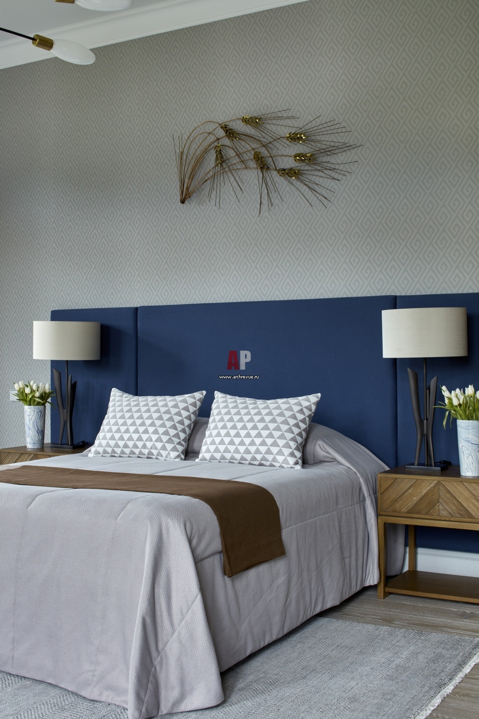 Гостевая спальня. Kровать сделана на заказ по эскизам дизайнеров. Прикроватные тумбочки, Crate and Barrel. Настольные лампы, Heathfield & Co. Панно «колья» из латуни, винтаж.
