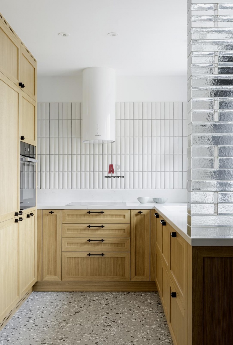 Кухонная мебель из светлого дуба сделана на заказ. Ее наполнение нестандартное: полки внутри расположены на створках. На полу – покрытие «терраццо», на фартуке – белая плитка.