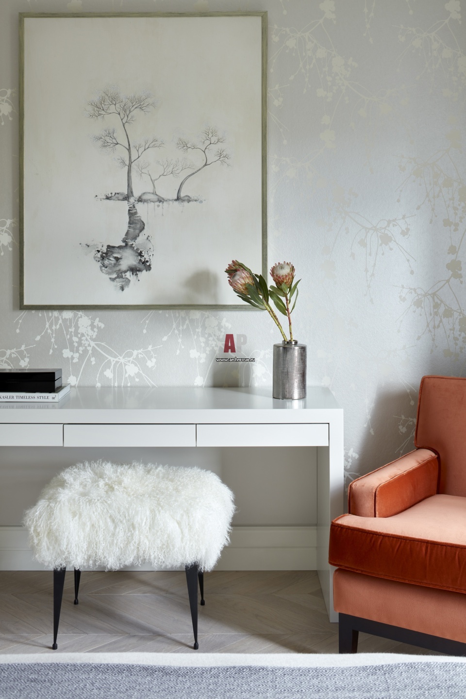 Интерьер спальни. Белая консоль, на заказ. Обои с мерцающим цветочным рисунком, Tapet-Cafe.