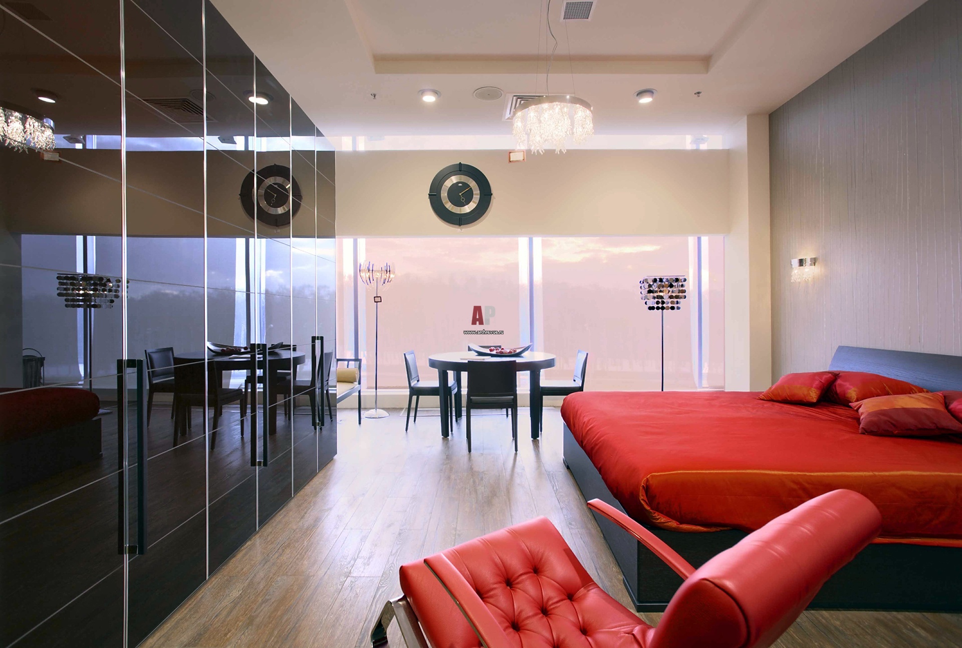 Интерьер салона-магазина мебели. Экспозиция современной мебели. Шкаф с лакированной поверхностью, кровать, Verardo. Столовый гарнитур из венге, Besana. Светильники, торшеры в современном стиле, Aureliano Toso.