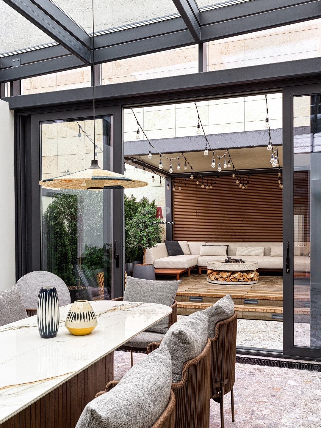 Особенность квартиры – две открытые террасы (50 и 20 кв. м). Чтобы можно было проводить время на террасе не только летом, но и в холодное время года, была создана закрытая часть с утеплением – стеклянный павильон, который потребовал долгих согласований и правильных инженерных расчетов.