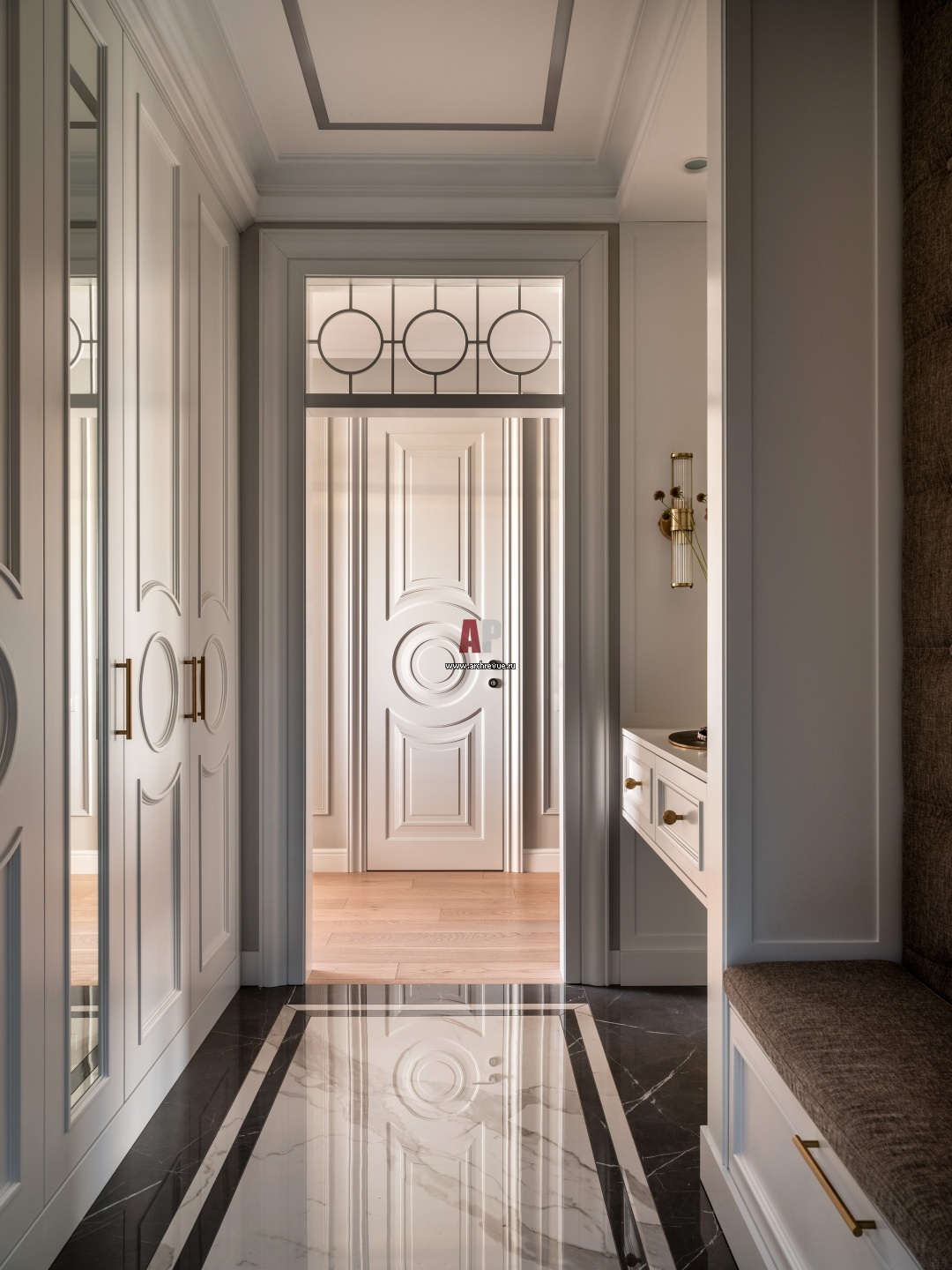 Прихожая с коридором отделяет общую часть от приватных спален. Белая столярка и дверь с фрамугой изготовлены на заказ. На полу – широкоформатный керамогранит под мрамор.