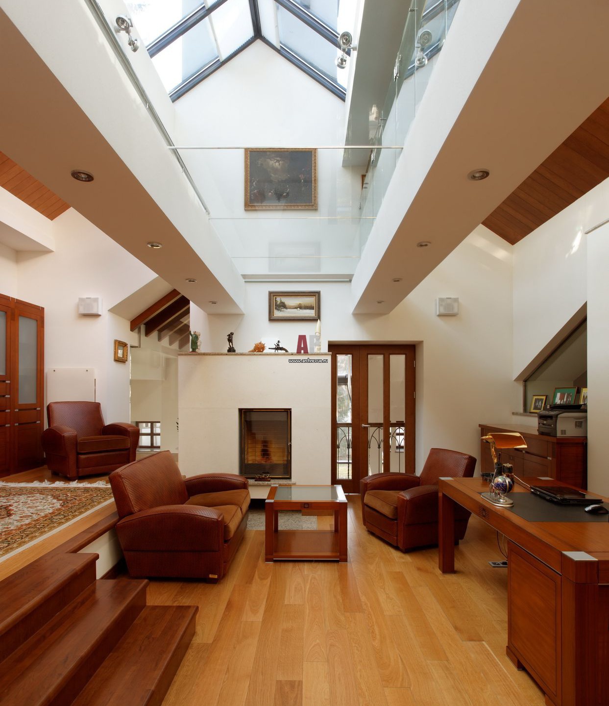 Потолок двухуровневого кабинета-галереи сделан в виде стеклянного перекрытия, по которому можно ходить. Изготовлением и монтажом стеклянных конструкций занималась компания «БАСТ 3».