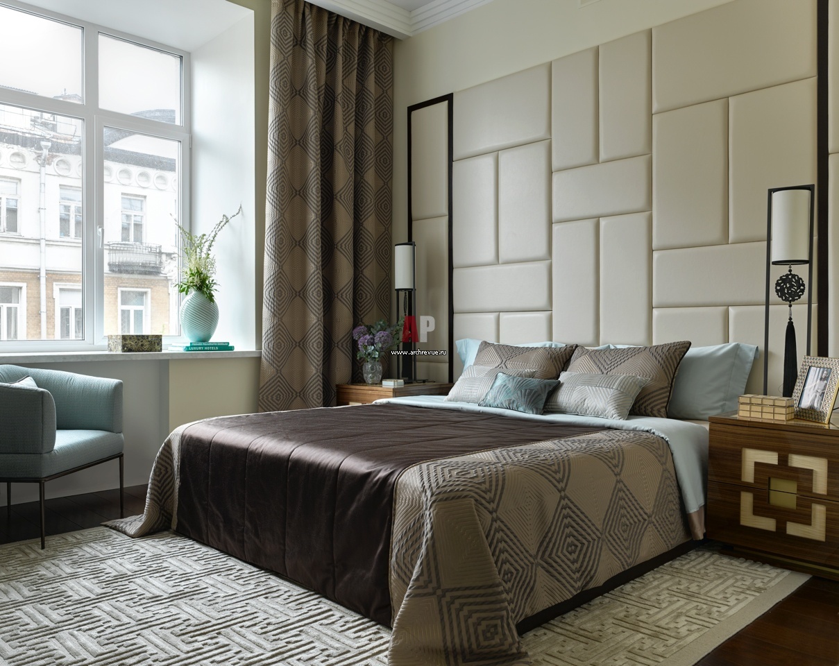 Интерьер спальни. Кожаная панель за изголовьем кровати сделана на заказ, в левой ее части скрыта встроенная система хранения. Аксессуары, Ralph Lauren. На подоконнике ваза, фарфор, селадон, лепка, мастер Сува Содзан, Япония, 1920-е годы.