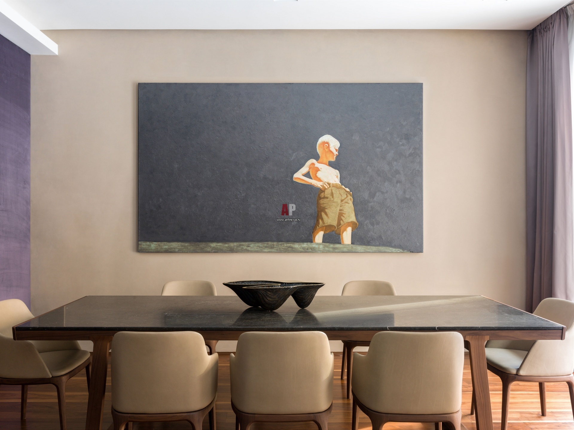 Столовая группа в современной гостиной. Обеденный стол и стулья, Poliform. На стене работа Леонида Ротаря.