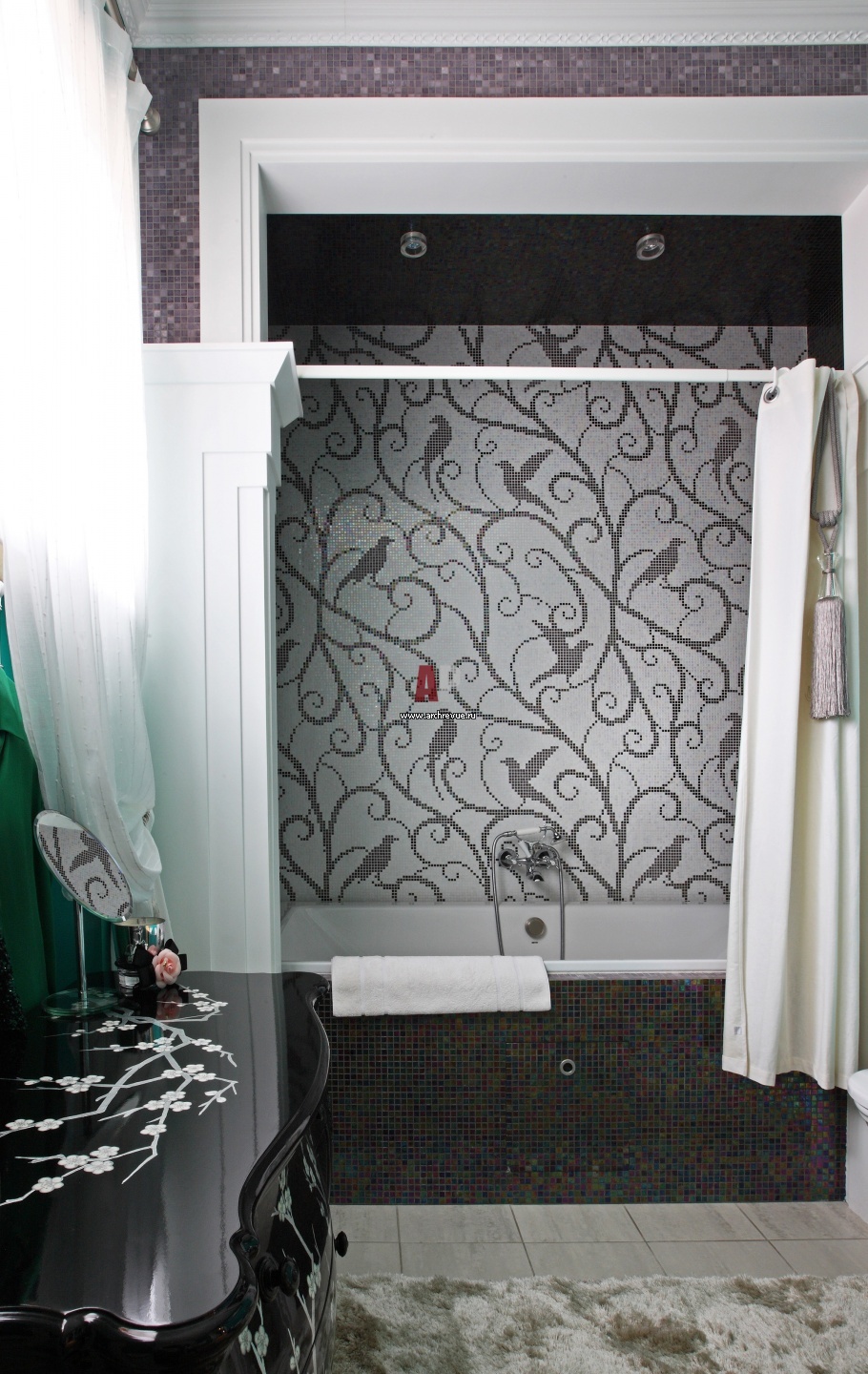Ванна в хозяйском санузле встроена в нишу. Стена за ней облицована мозаикой с изображением птиц, Sicis.