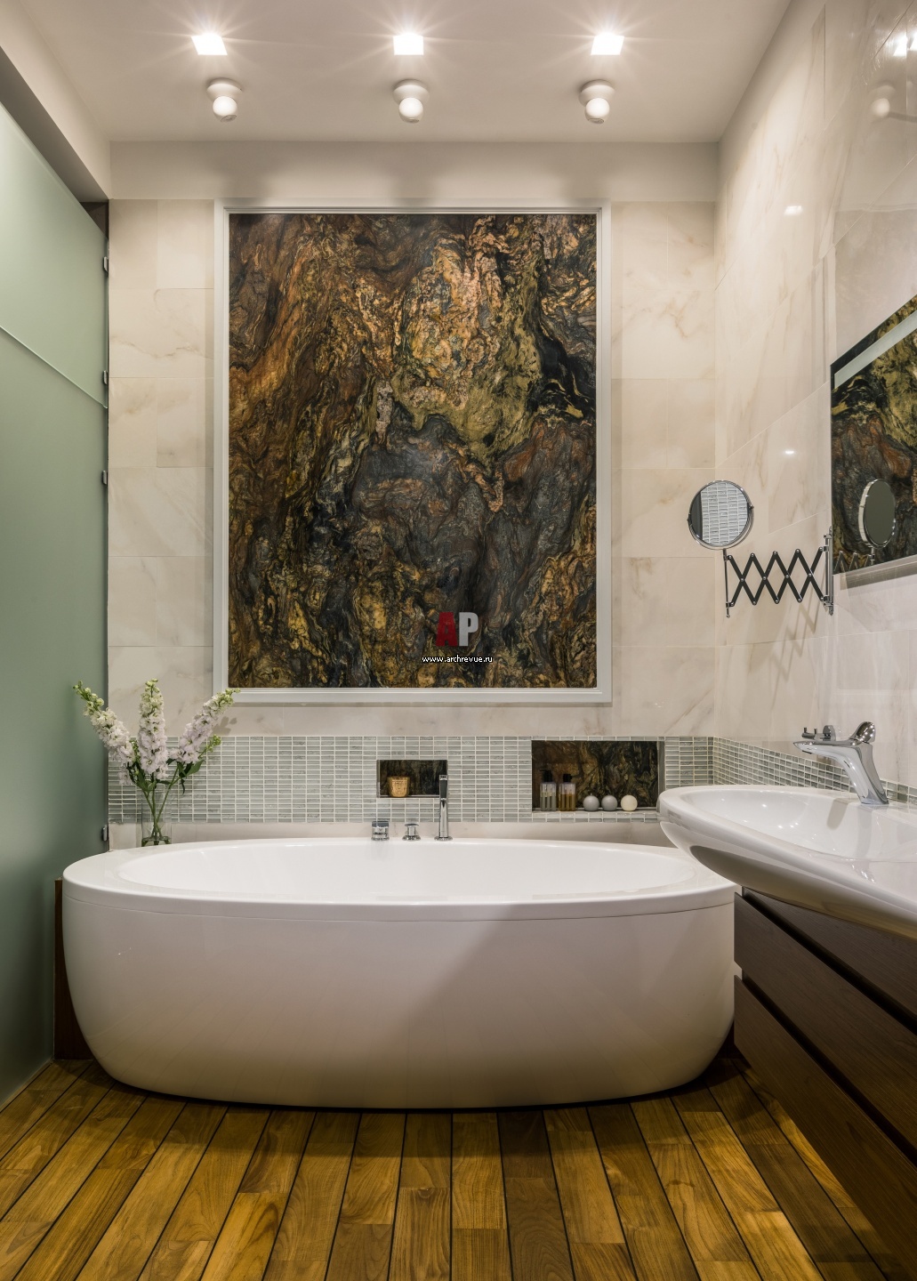 Интерьер главной ванной комнаты. Одну стену помещения украшает полноразмерный слэб гранита, он обрамлен гипсовой рамой и светлым керамогранитом. Ванна, Laufen, модель Alessi.