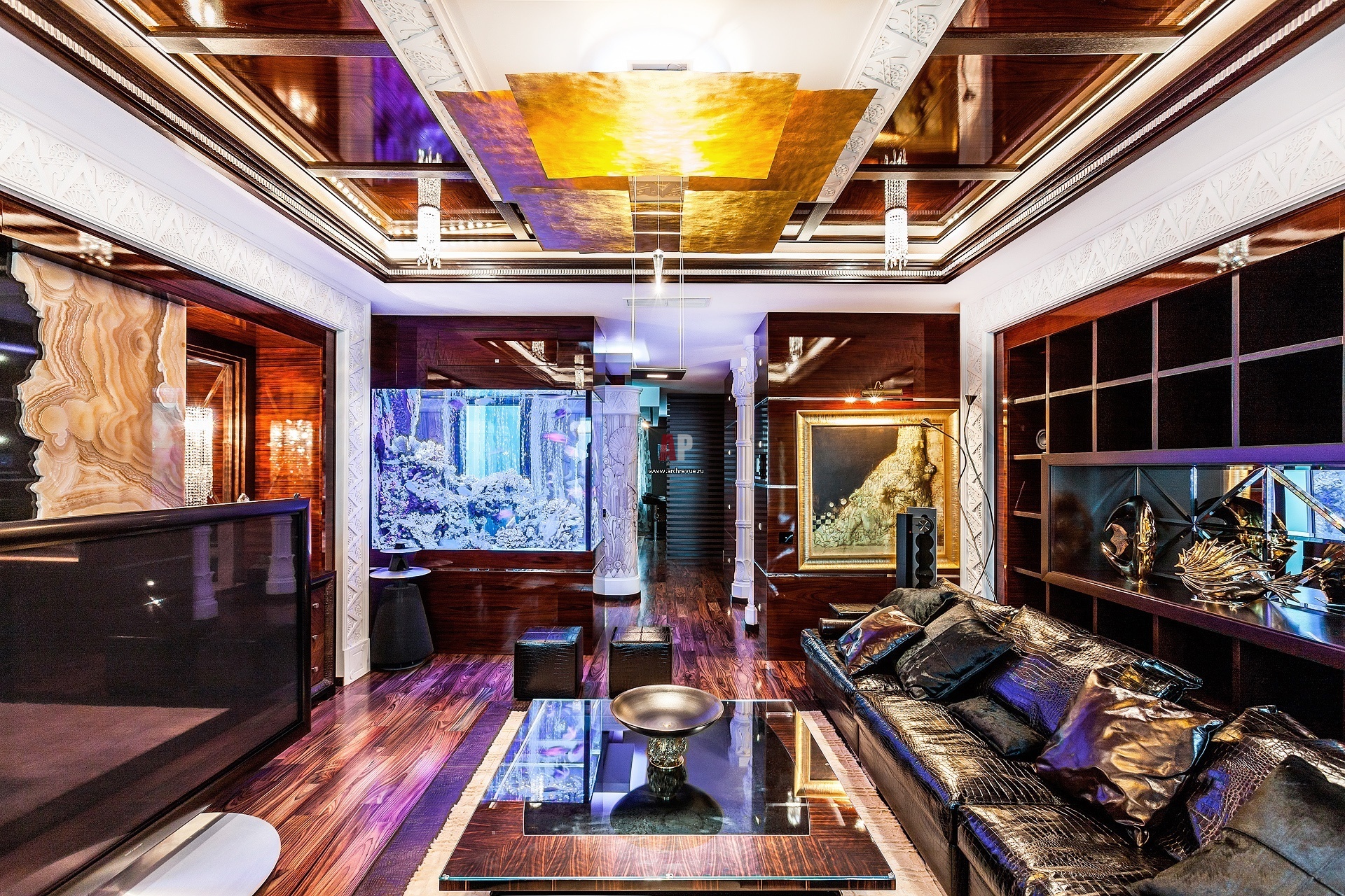 Интерьер гостиной в эклектичном стиле с фактурами оникса, полированного палисандра. Облицованная деревом конструкция с аквариумом служит границей между гостиной и входным холлом. Диваны, Fendi. Журнальный стол, Francesco Molon. Ковер, Smania.