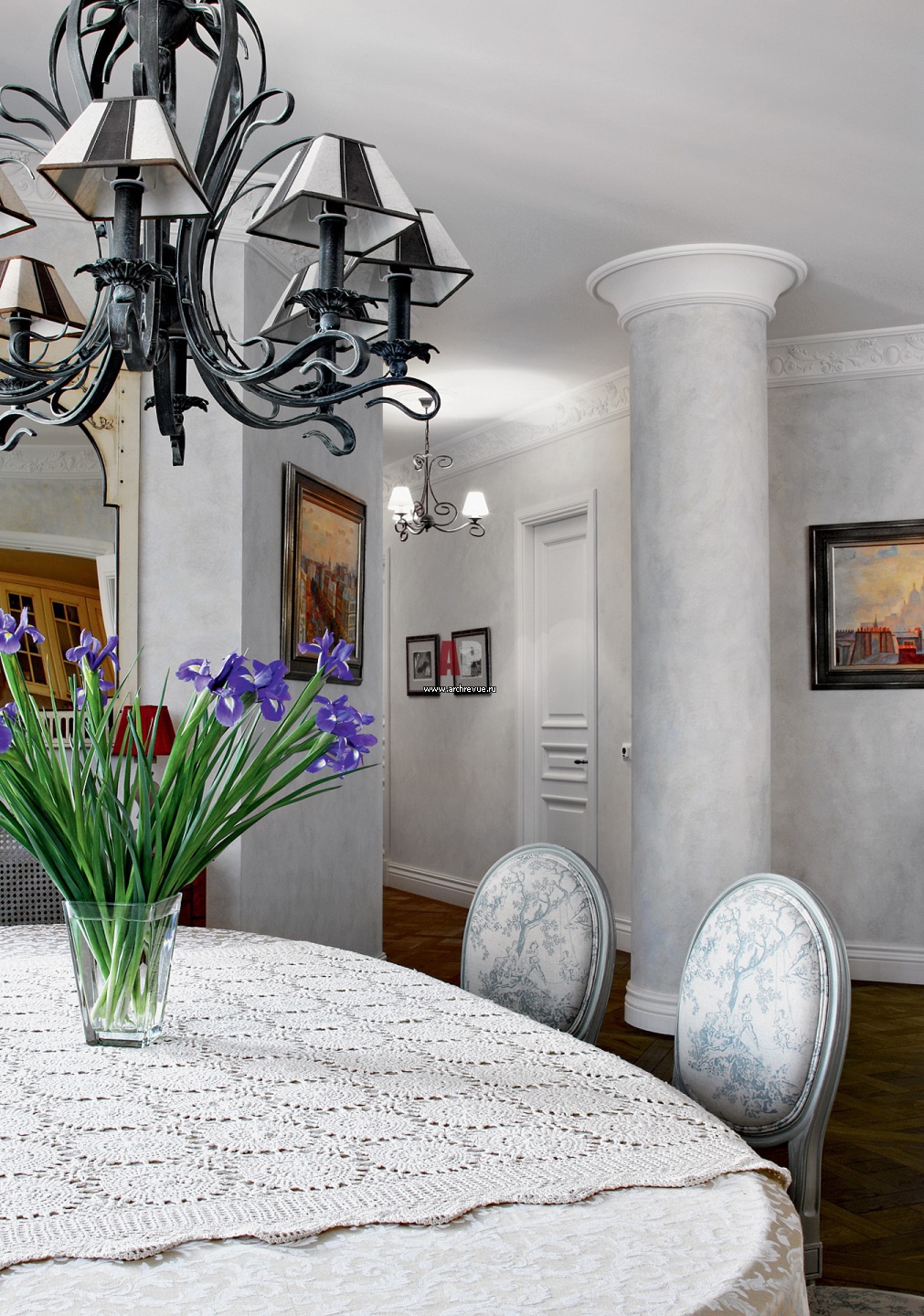 Интерьер столовой в жемчужных тонах. Потолок украшен высоким карнизом с цветочным орнаментом. На овальном обеденном столе – белая кружевная скатерть. Черная кованая люстра, Artesania Joalpa.