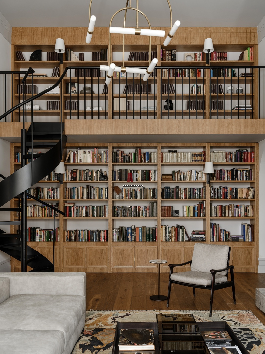 Библиотека в гостиной изготовлена на заказ по чертежам архитекторов из дуба. Кресло, Giorgetti.