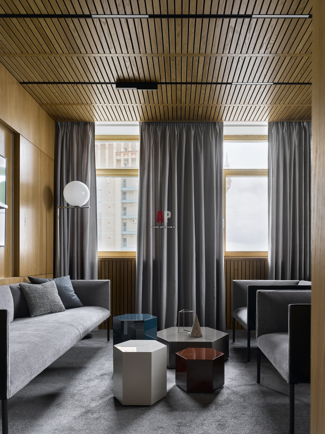 Кабинет выполняет также функцию медиакомнаты. Его стены и потолок зашиты деревом в том числе для звукоизоляции. Диван и кресла, B&B Italia. Журнальные столики, Minotti. Торшер, Flos. Трековый светильник, Centrsvet.