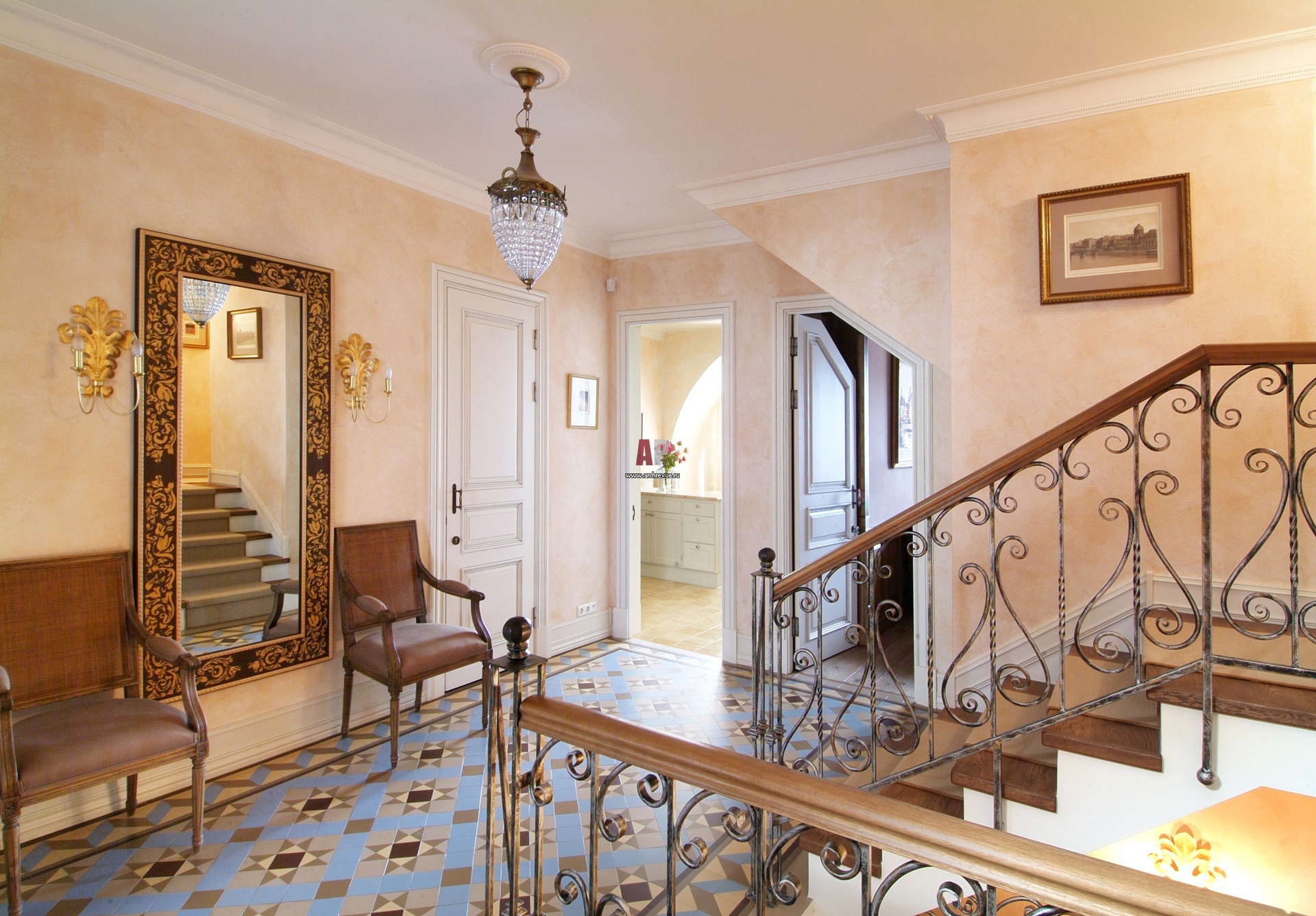 Холл с лестницей в квартире в восточном стиле. Лестница украшена кованым патинированным ограждением с восточным орнаментом. На полу – мозаичный ковер из метлахской плитки Winckelmans, поставщик «Грета Вульф».