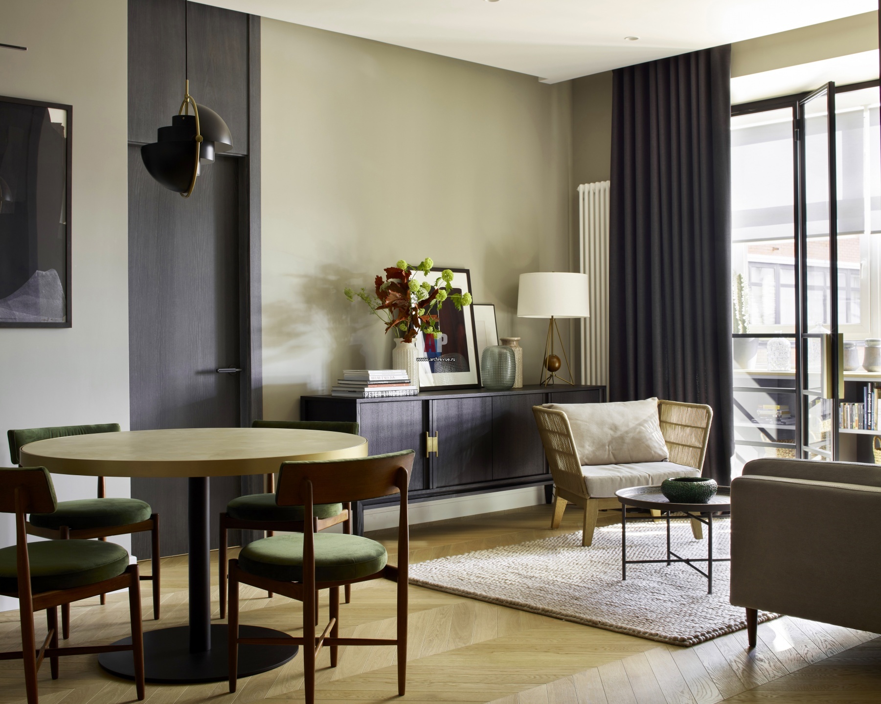 Интерьер гостиной, объединенной с кухней. На полу – массивная доска, дуб «французская елка», Matraparkett, модель Solid Shevron, Grandiose, цвет Siver. Мягкая и корпусная мебель из темного дерева российского производства.