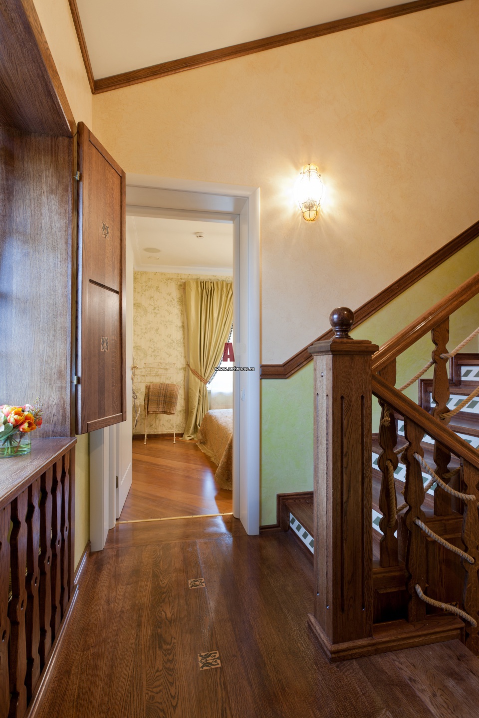 Лестничный холл второго этажа. Лестница из тонированного дуба, на подступенках вставки английской керамической плитки.