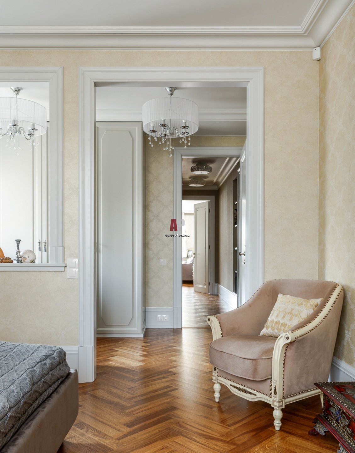 Интерьер квартиры для музыканта. Спальня, гардеробная, холл, музыкальная студия-кабинет выстроены в анфиладу. На стенах – текстильные обои.