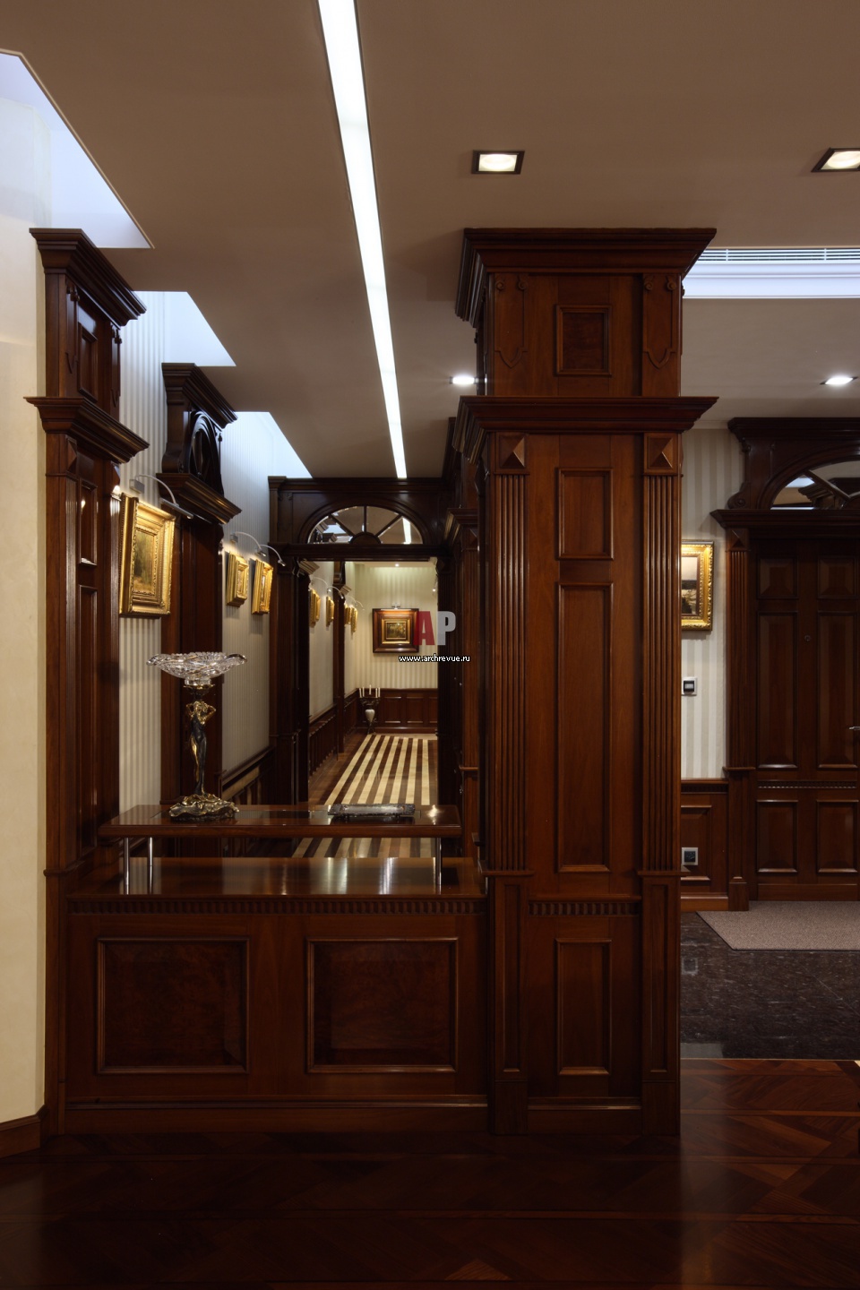 Стены коридора декорированы деревянными панелями из неаполитанского ореха с филёнками, а также натуральным шёлком и украшены картинами и гравюрами из коллекции хозяев. Двери и порталы с фрамугами, в которых вместо стёкол состаренные зеркала, выполнены по эскизам авторов проекта на фабрике Colombo Mobili.