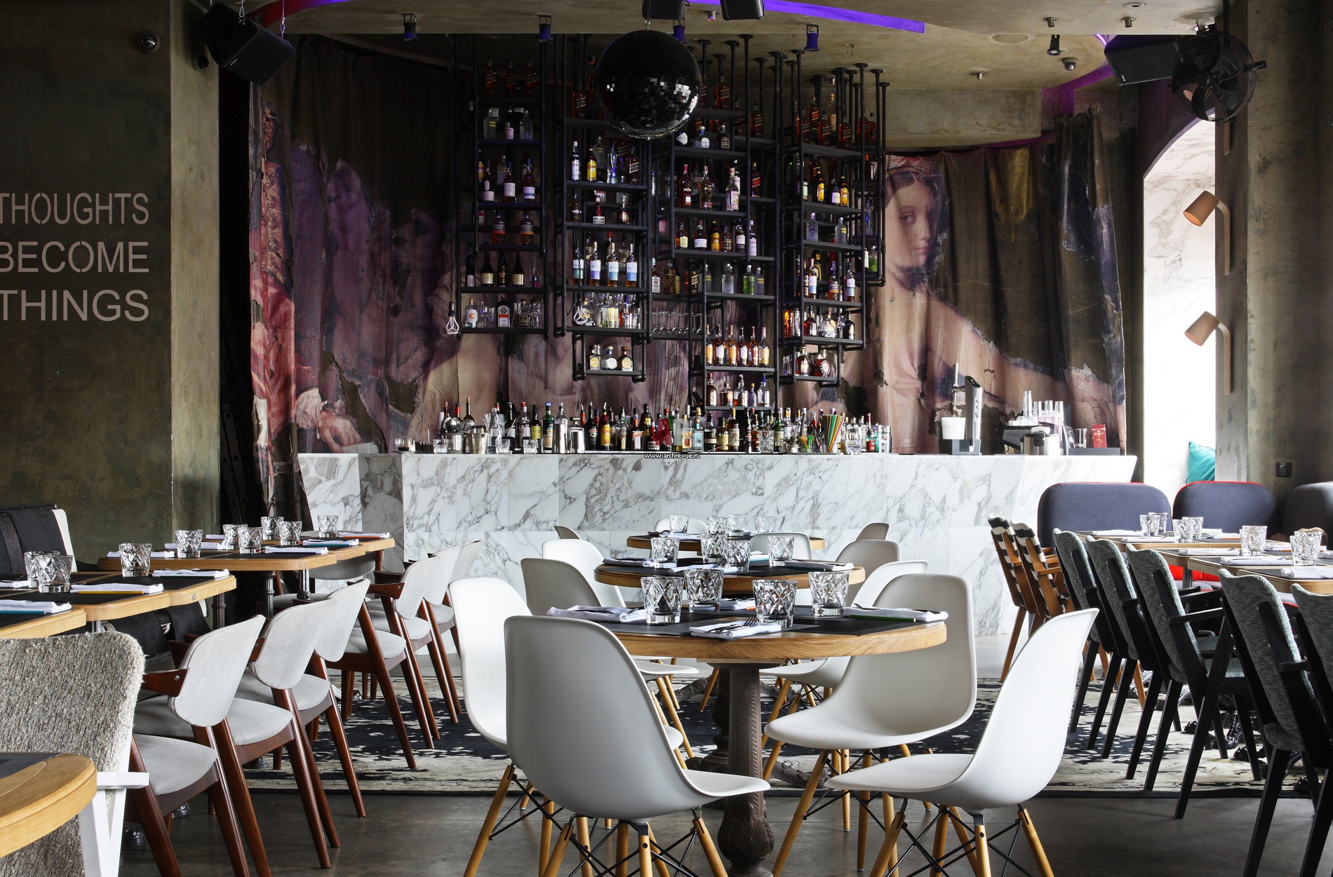 На фото – зона бара ресторана. Барная стойка в виде мраморного айсберга. Каменная поверхность с гранями имеет сложную геометрию. На бархатном занавесе – отпечатан коллаж из работ мастеров Возрождения.