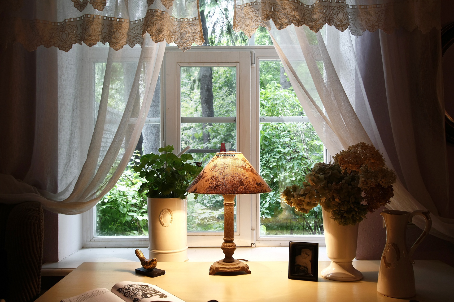Фото интерьера старой дачи. Традиционный уклад подчеркивают шторы с вышивкой в технике ришелье.
