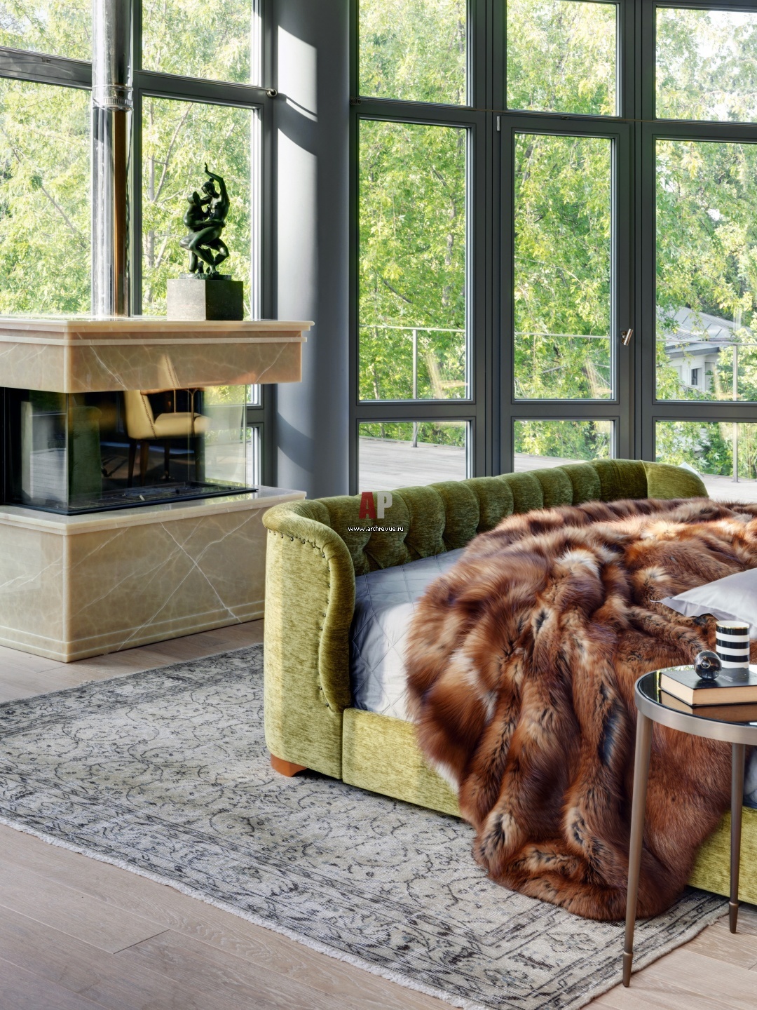 В спальне возле окна установлен камин. Кровать, Sofas & Stuff. Постельное белье Yves Delorme (коллекции Athena Platine, покрывало Triomphe Platine). Сверху – плед из меха золотой лисицы. Ковер, винтаж, Restoration Hardware.