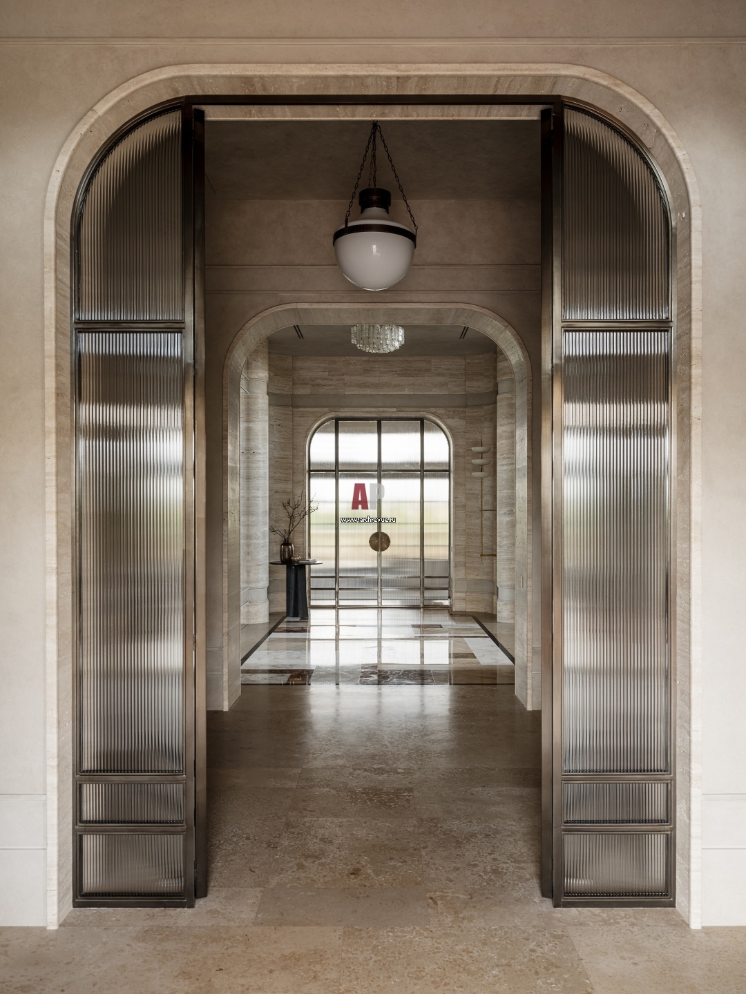 Загородный дом с чувственным дизайном. Парадный холл с анфиладой из арочных дверей.