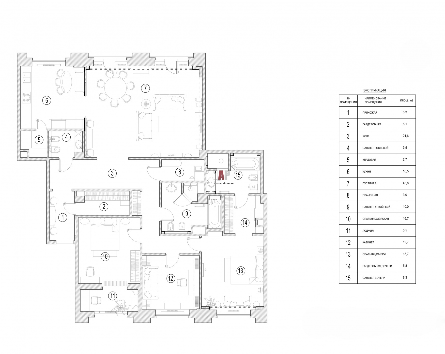 План 4-х комнатной квартиры для приемов и временного проживания. Общая площадь – 183 кв. м.
