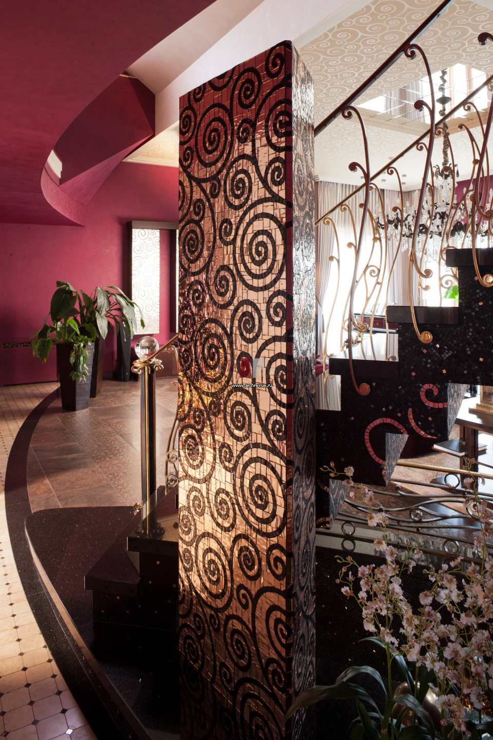 Опорная колонна лестницы облицована черно-золотой мозаикой с характерными завитками.