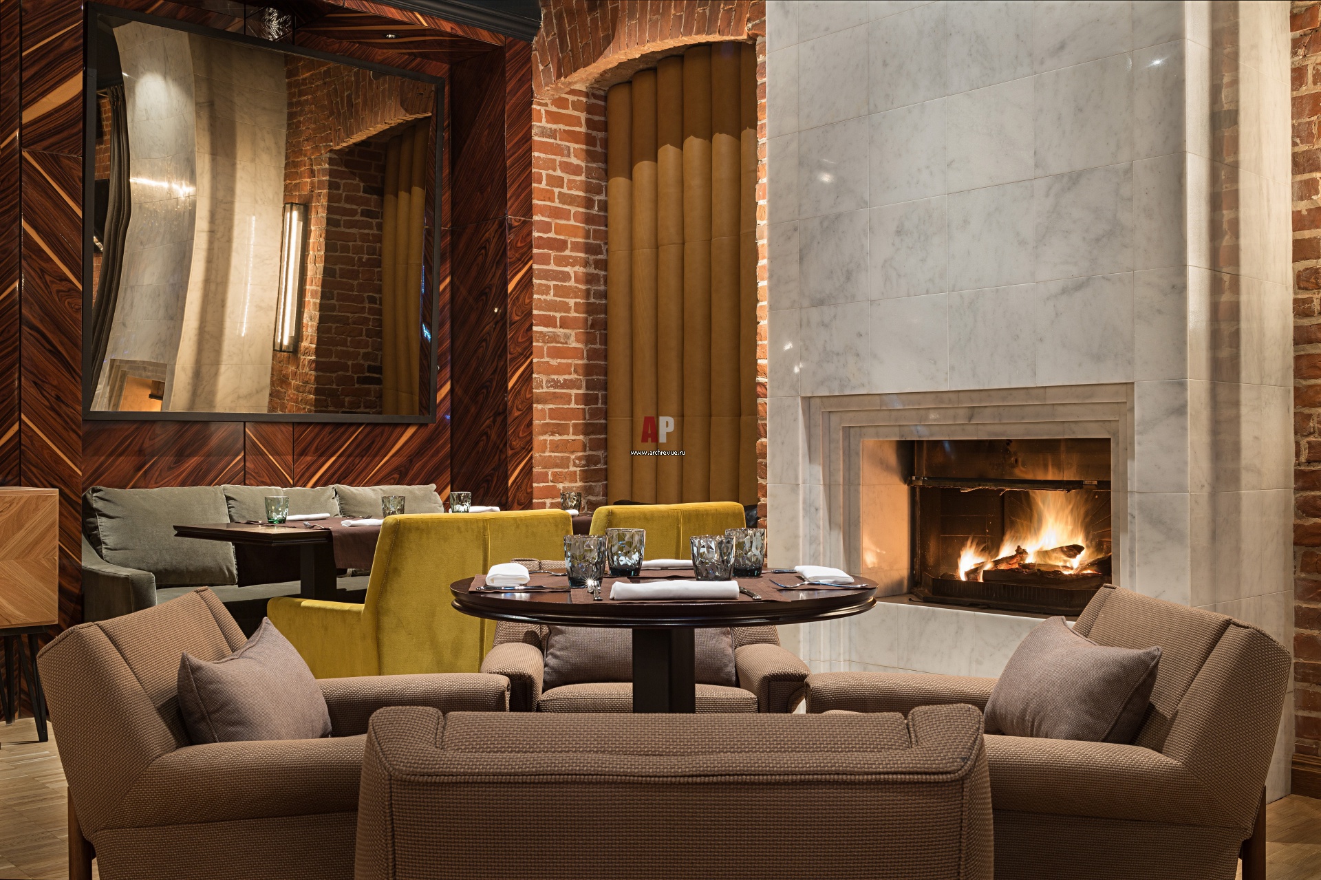 В VIP-зале организована зона отдыха с камином. Облицовка камина мрамором теплого оттенка создает уютную, домашнюю обстановку.