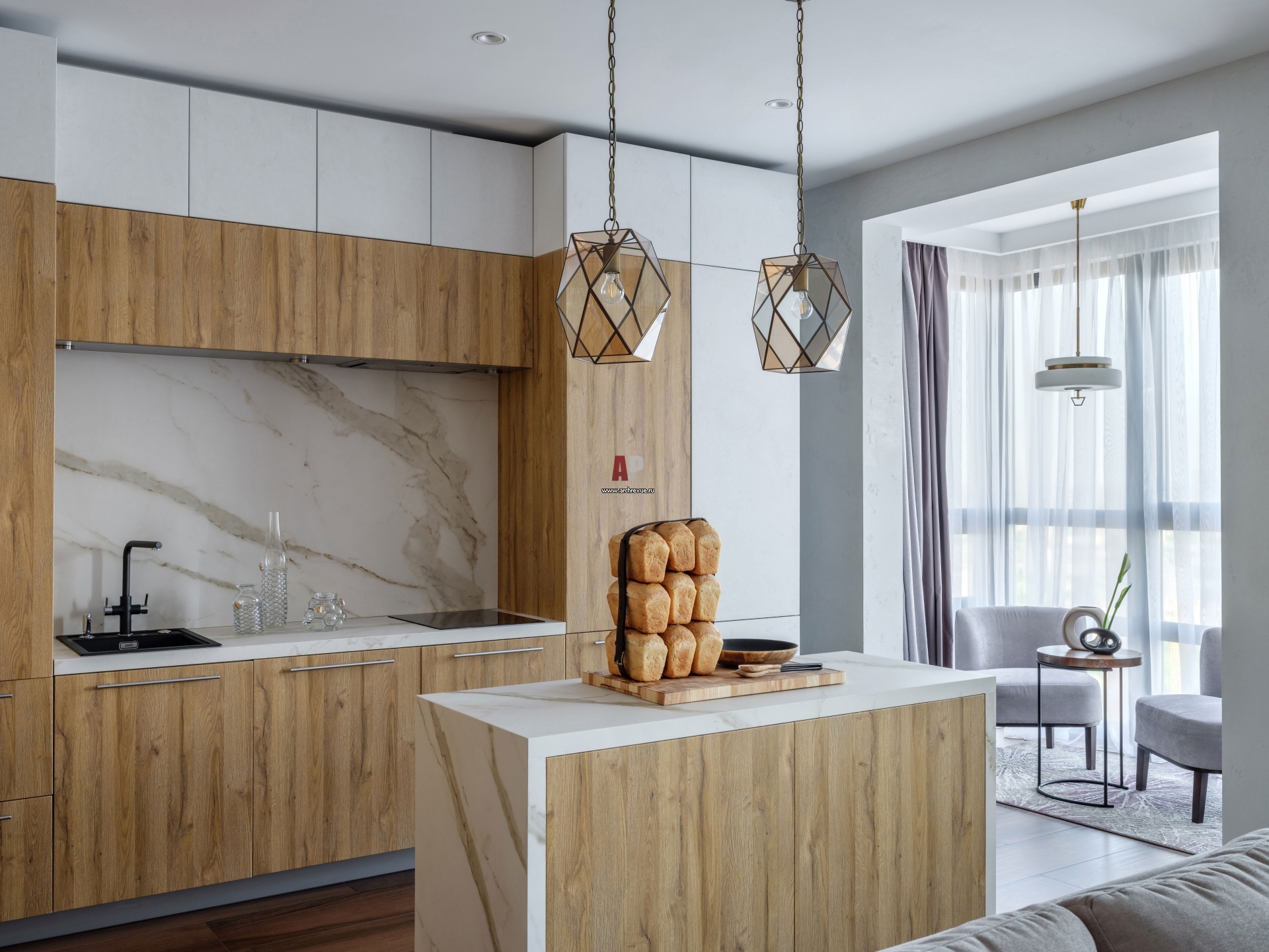 Светлая семейная квартира в современном стиле. Кухня получилась фоновой: ее фасады в отделке шпоном светлым деревом и штукатуркой «под бетон» перекликаются с оформлением стен в гостиной.