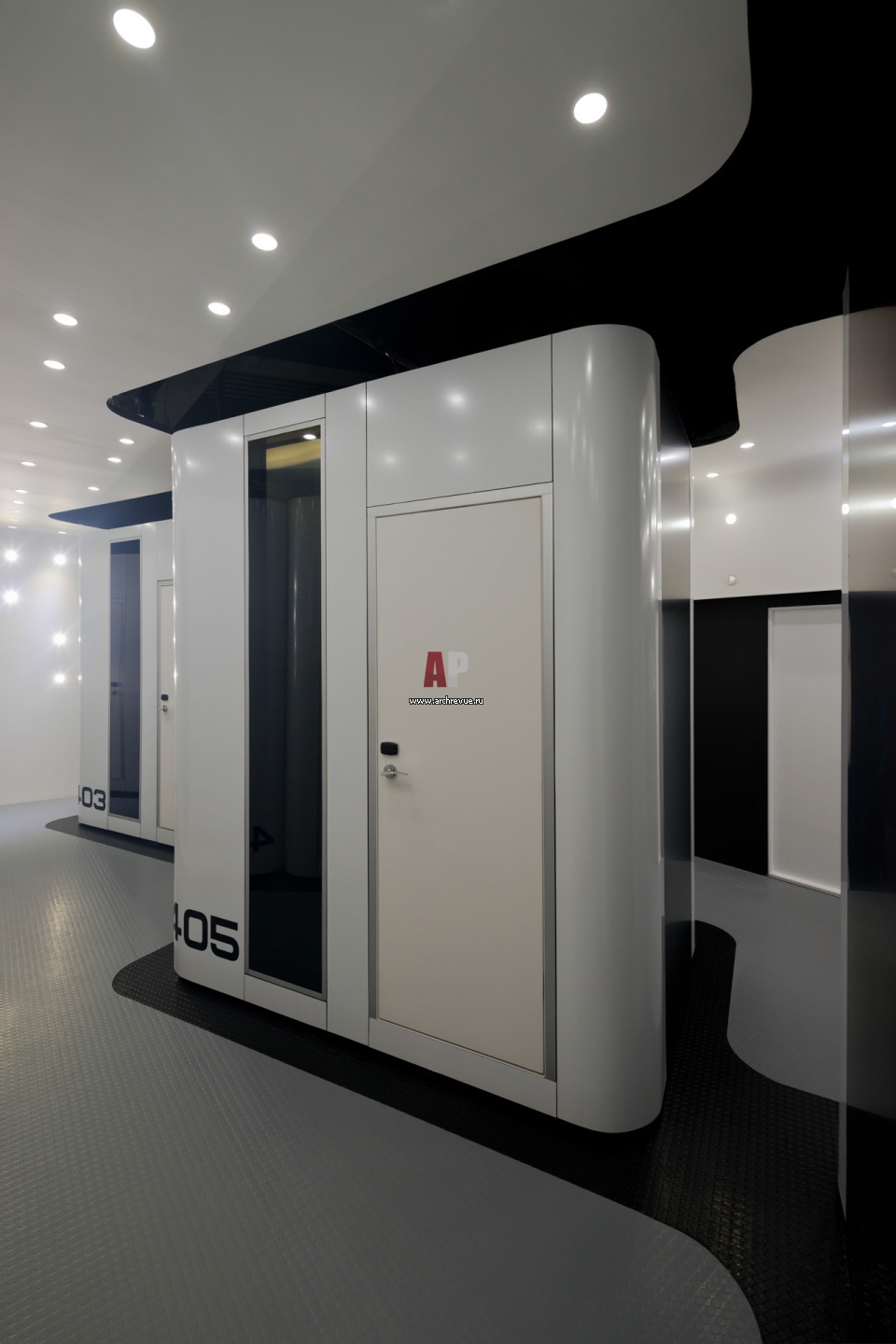 Интерьер холла отеля. Группа слипбоксов третьего этажа. Рисунок пола повторяет рисунок потолка, поэтому каждая группа боксов визуально отделена от стен и пола черной зоной.