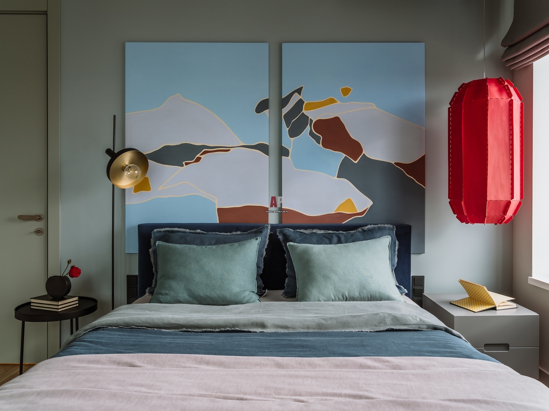 Спальня. Кровать, Twils. Тумбочка, Novamobili. Столик, Northern. Красный светильник, LZF Lamps. Торшер, Faro. Декоративное панно работы Марии Власовой.