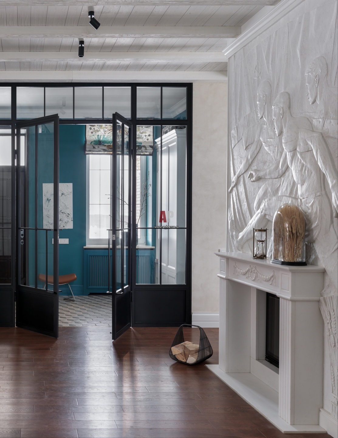 Проходная зона с камином и барельефом. Чтобы зрительно расширить объем гостиной и впустить свет, установлены высокие стеклянные перегородки на сварном каркасе с фрамугами.