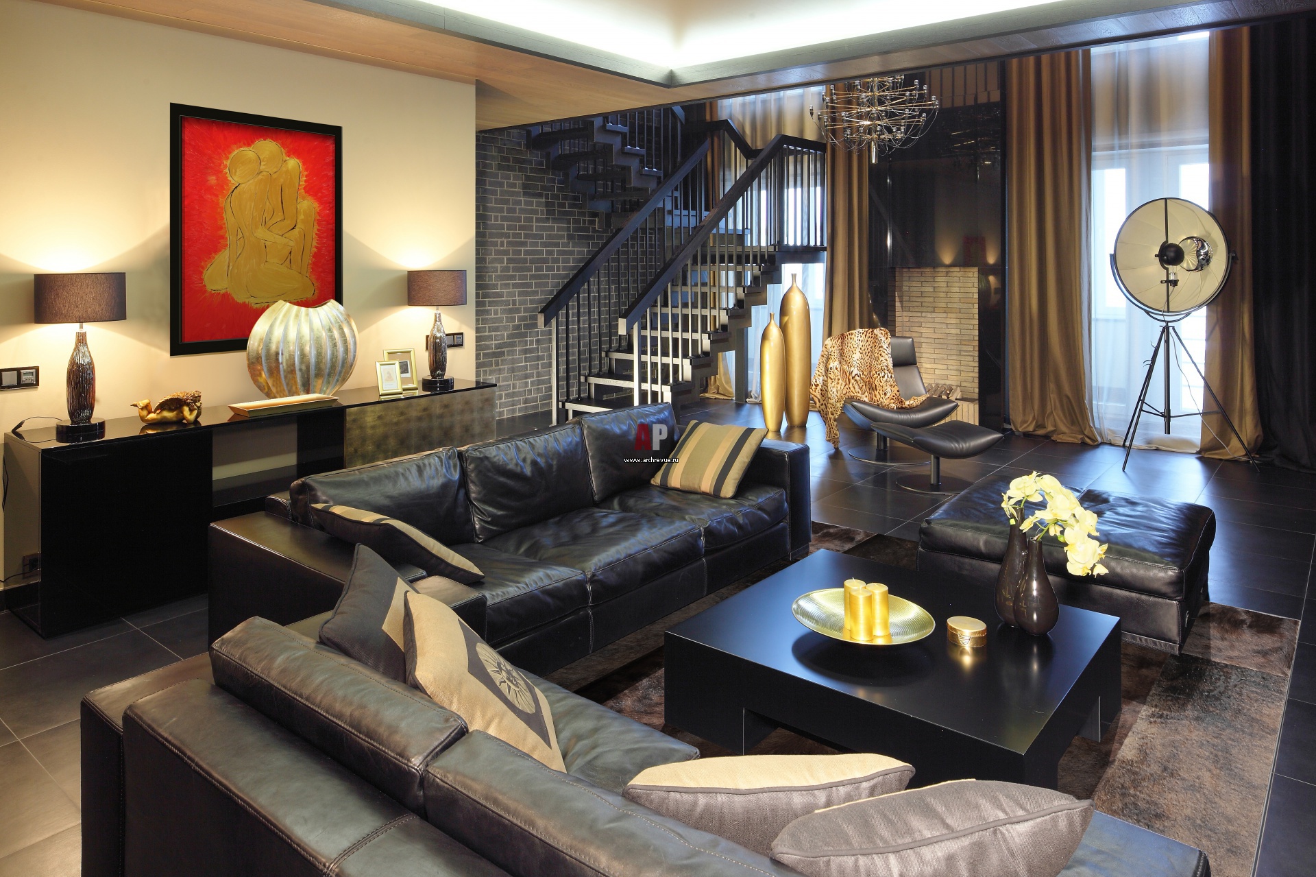 В интерьере гостиной присутствуют черты лофта. Часть стен оформлена плиткой Rex, имитирующей кирпич. Портал камина сделан из черного полированного гранита, топка выложена из кирпича. Черные кожаные диваны, столик, Longhi. Комод с золочением, Besana.