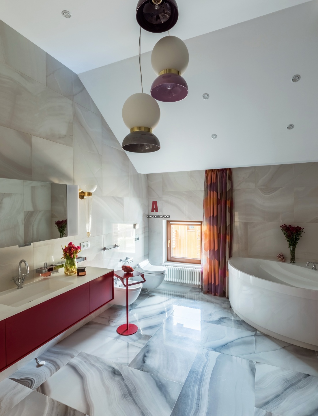 Ванная комната при хозяйской спальне с красной мебелью. Угловая ванна, Villeroy & Boch. Система хранения, Antonio Lupi.