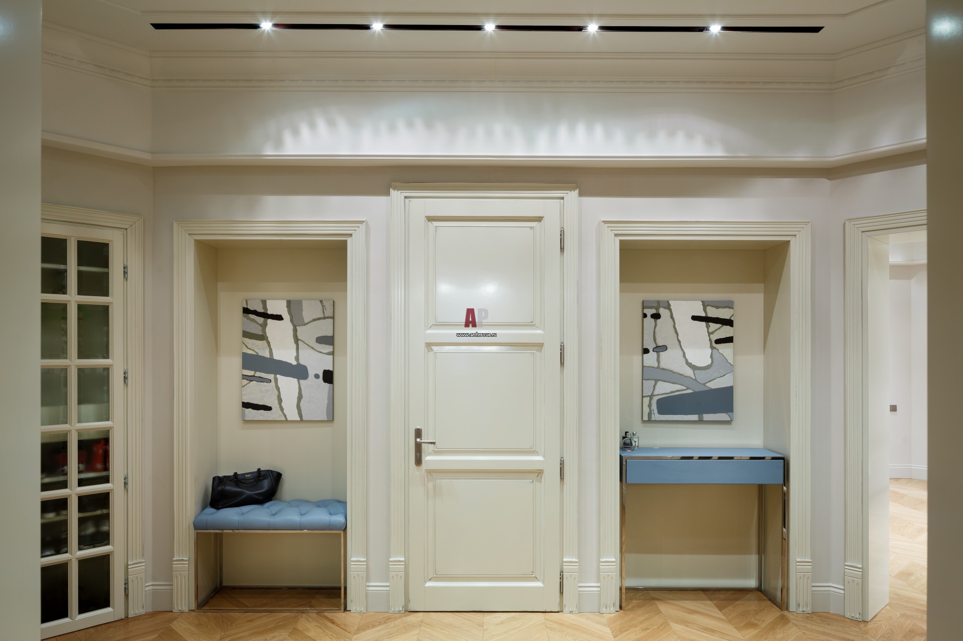Питерская квартира в дореволюционном доме. Интерьер прихожей. Двери, эмаль, слоновая кость. Банкетка, консоль из голубой кожи, на заказ, по эскизам автора проекта.