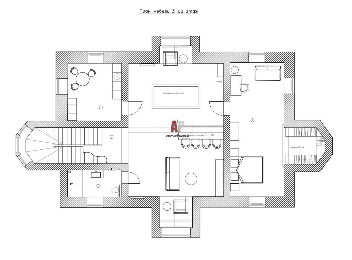 Планировка 3 этажа 3-х этажного дома в Подмосковье. Общая площадь - 650 кв. м.