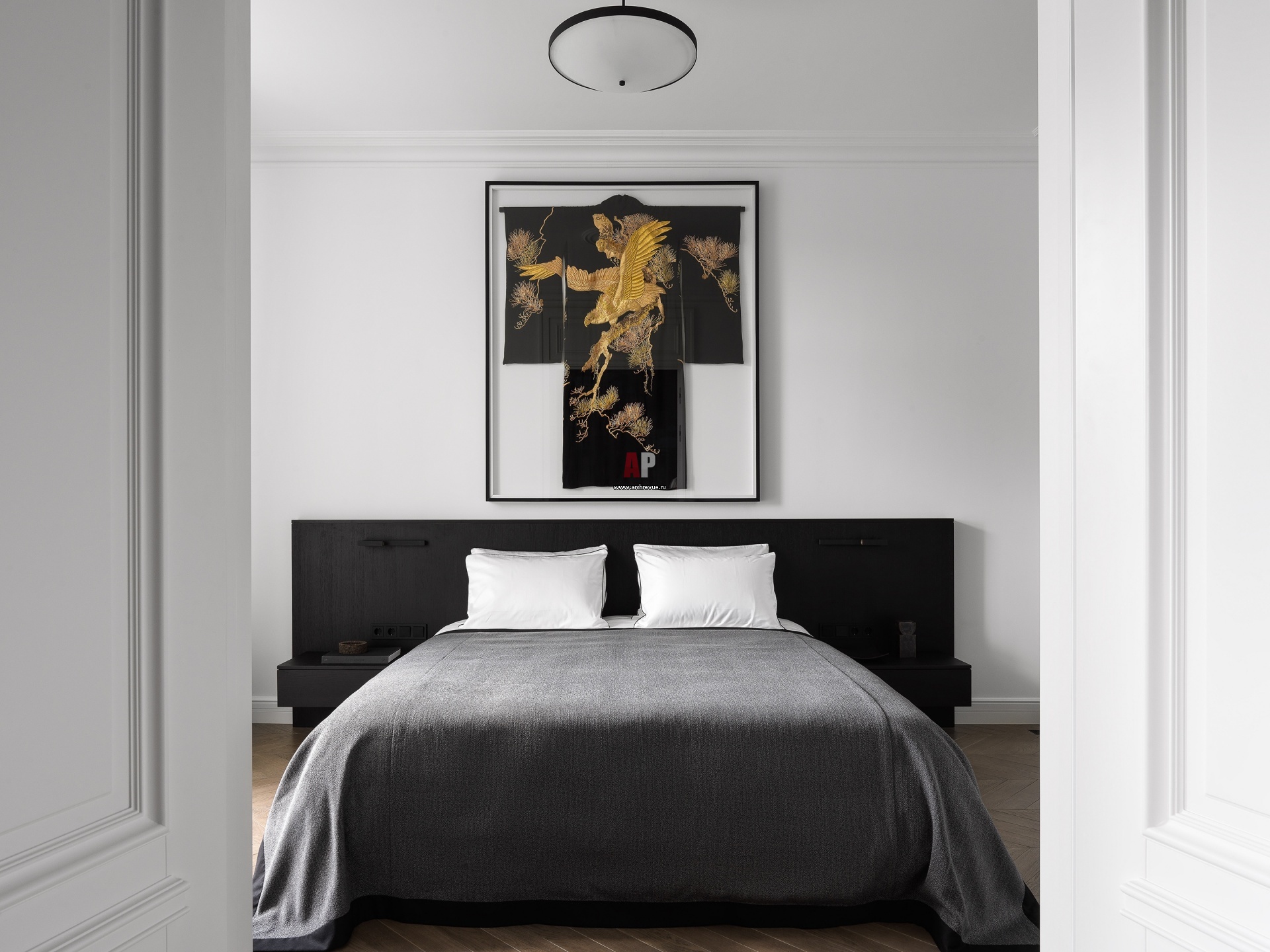 В главной спальне ключевой элемент – мужское свадебное кимоно с очень редким декоративным мотивом: изображением орла. Это копия оригинального кимоно начала XX века, которое заказчики нашли в Нью-Йорке, в культовом винтажном магазине NEW YORK VINTAGE. Черный лакированный бокс с музейным стеклом изготовили в московской мастерской, отделку черным лаком выбрали по ассоциации с японскими черными лаковыми напольными стойками для кимоно.
