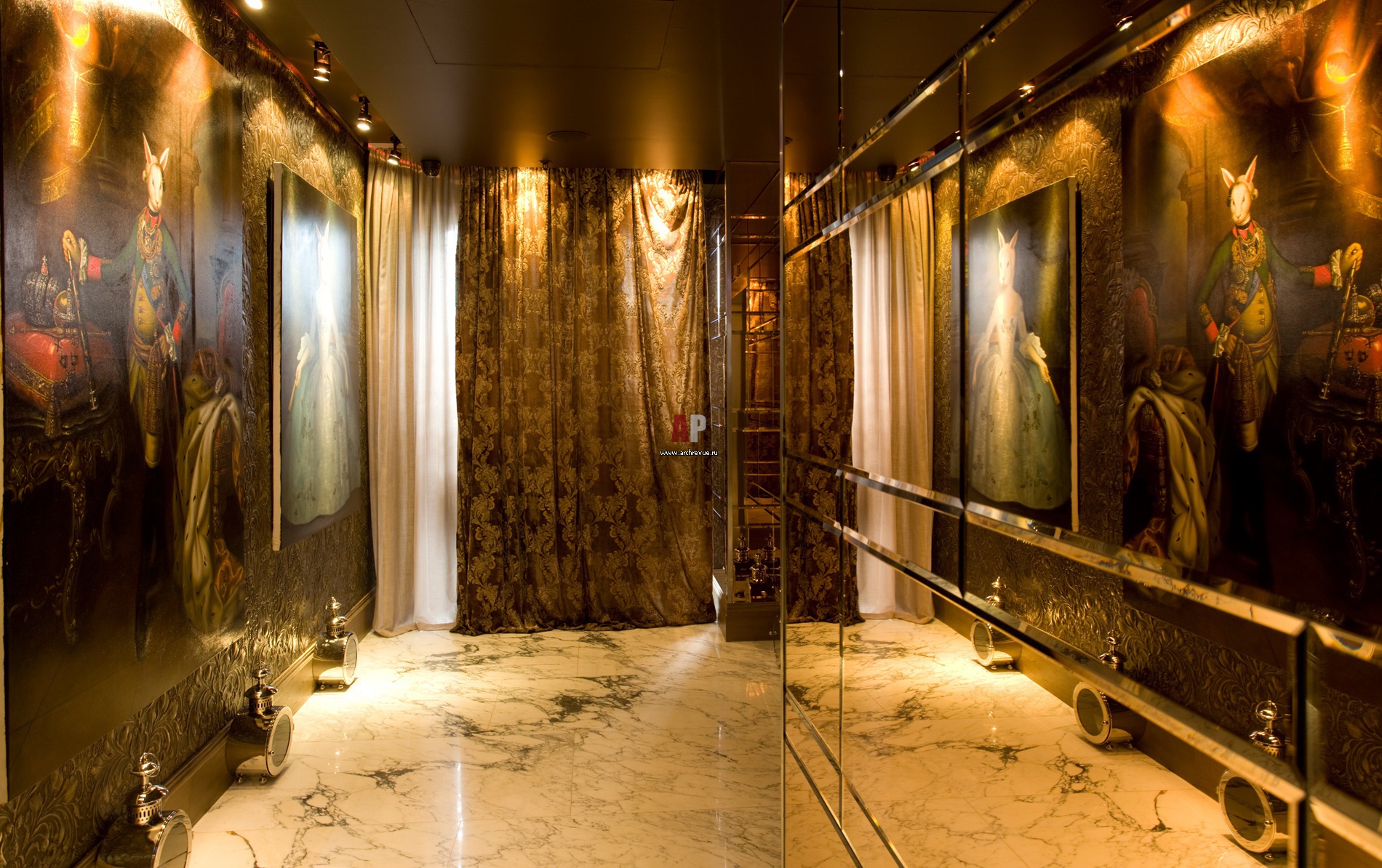 Холл расположен на нижнем уровне заведения. Стены декорированы линкрустой. Пол выложен мрамором сорта «Арабескато корчиа», поставщик «Мрамор.ru». Портреты кроликов писались на заказ в Тайланде местными художниками.