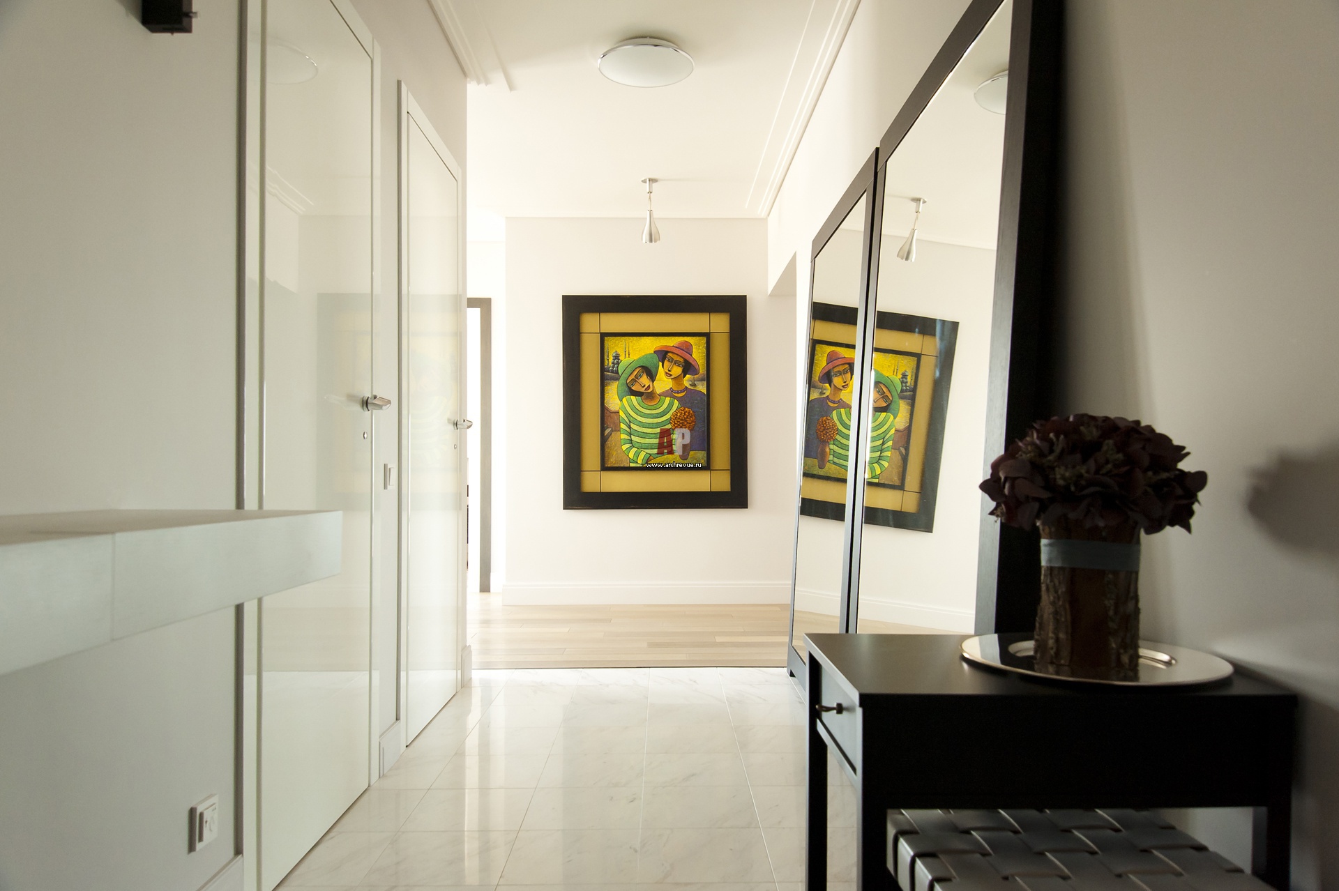 Прихожая в белых тонах. На полу «мокрой зоны» - белый с серыми прожилками мрамор. Межкомнатные двери в белом лаке. Яркое пятно – живописное полотно.