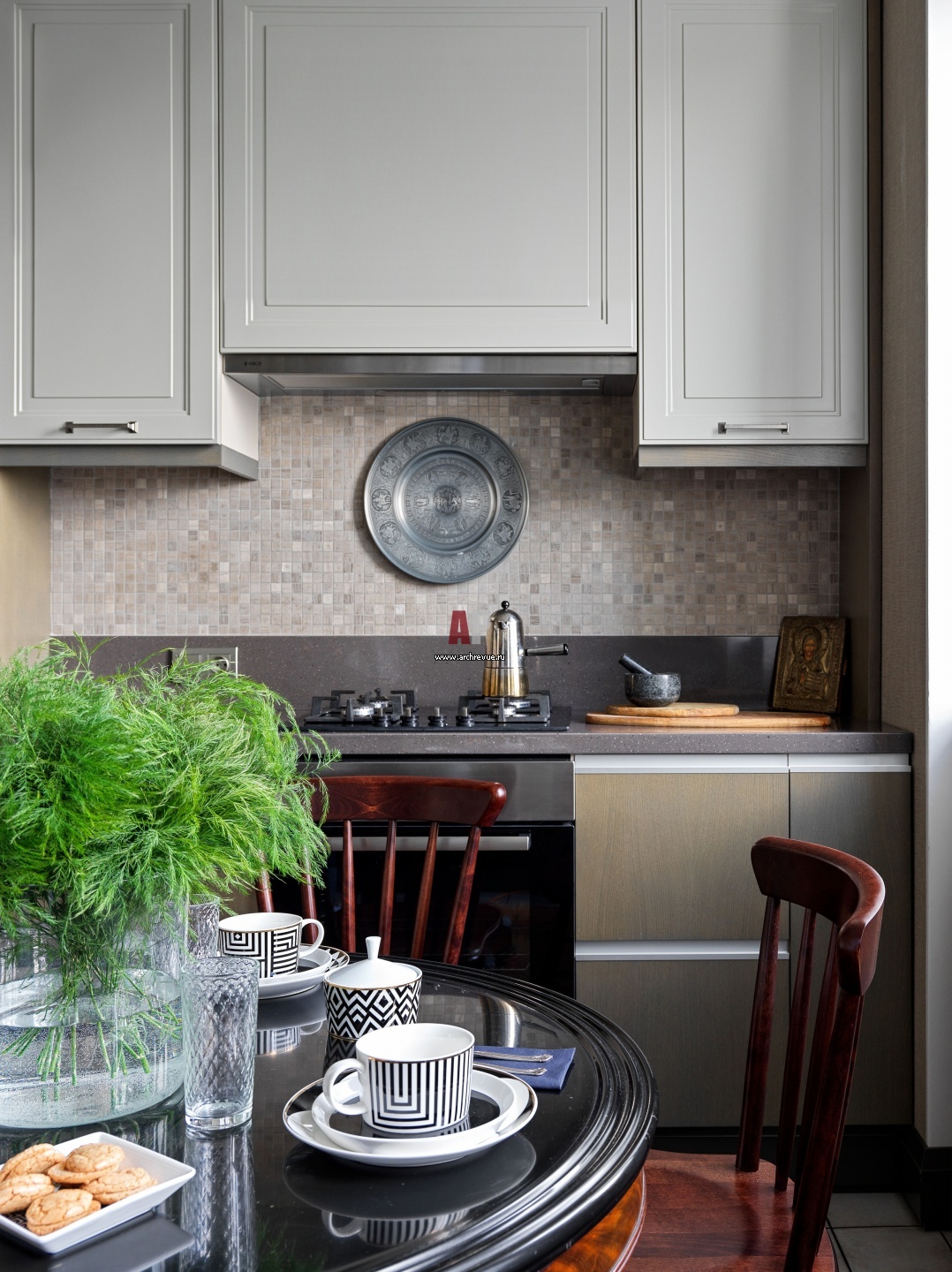 Кухня изначально имела хорошие пропорции: мойка и газовая плита разведены по двум сторонам, по центру – стол для завтраков. Такое зонировние оказалось очень удобным и для повседневной жизни, и для приема гостей, в случае, когда хочется посидеть на кухне.