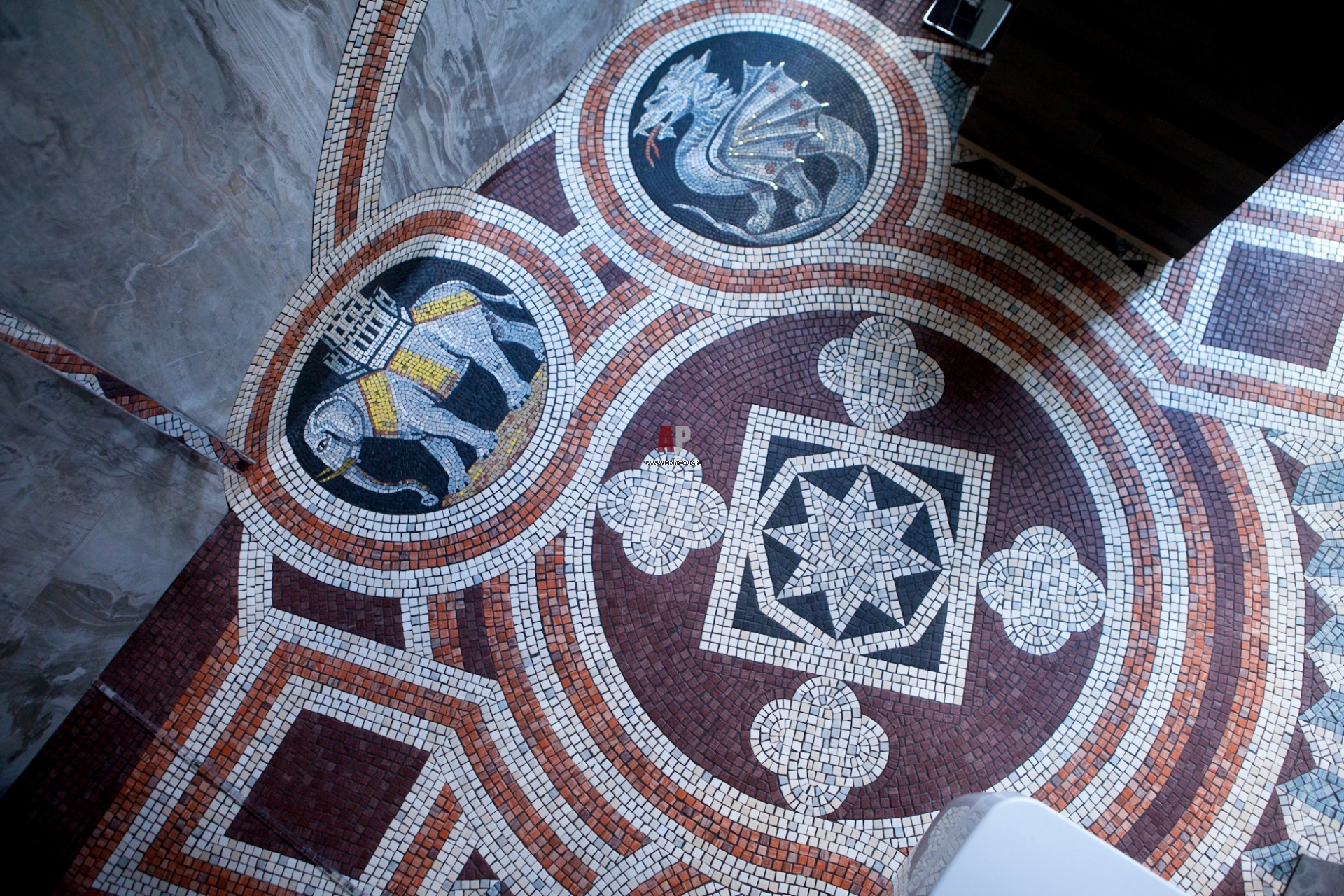 Все составляющие мозаичного панно на полу ванной комнаты выполнены из миниатюрных элементов смальта-керамики, врезанных в широкоформатные плиты тонкого керамогранита.