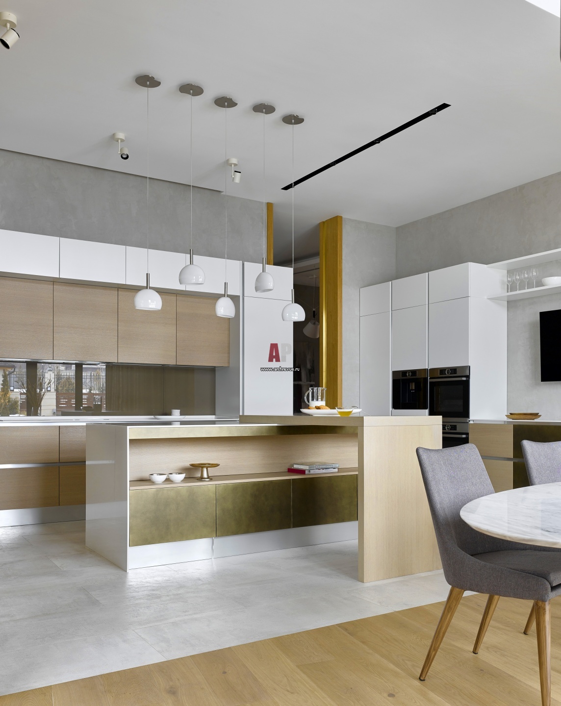 Современный дом с природными мотивами. Интерьер кухни с облегченными фасадами из светлого дерева, белых матовых панелей и отделкой из латуни.