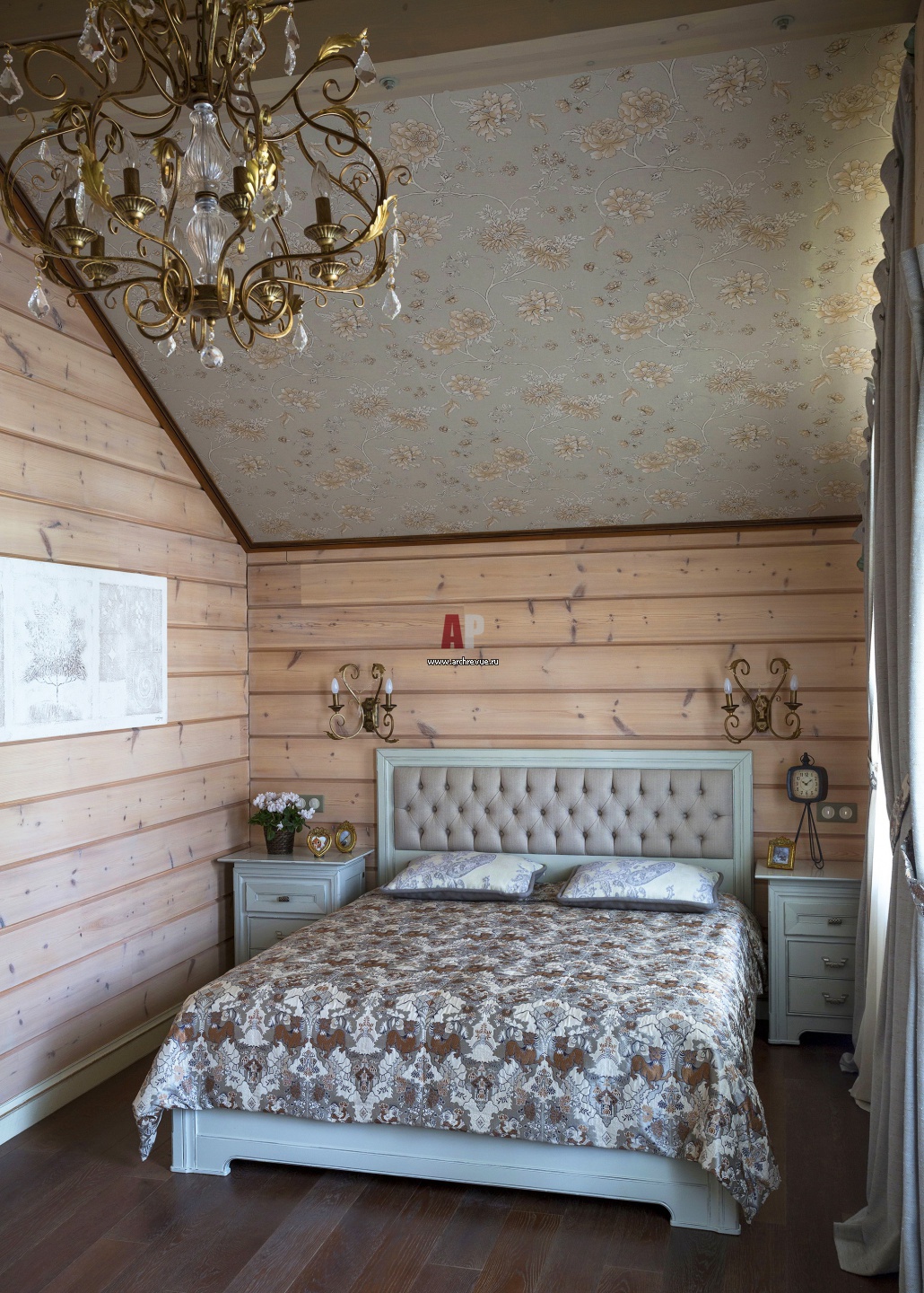 Интерьер гостевой спальни. Ковать, прикроватные тумбы, Tonin Casa. Пол, дуб, тонированный по образцу, поставщик «Олимп Паркета».