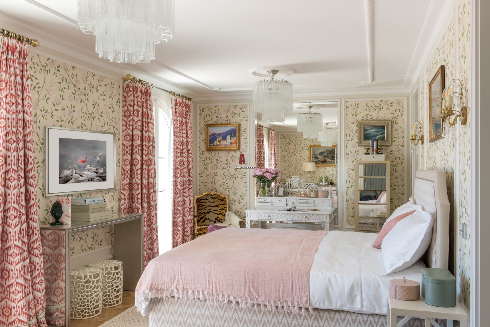 Хозяйская спальня оформлена в стиле belle époque. Кровать с высоким изголовьем, Hypnos. Пуфы, Made Goods. Изящный туалетный столик сделан на заказ, по эскизам дизайнеров.