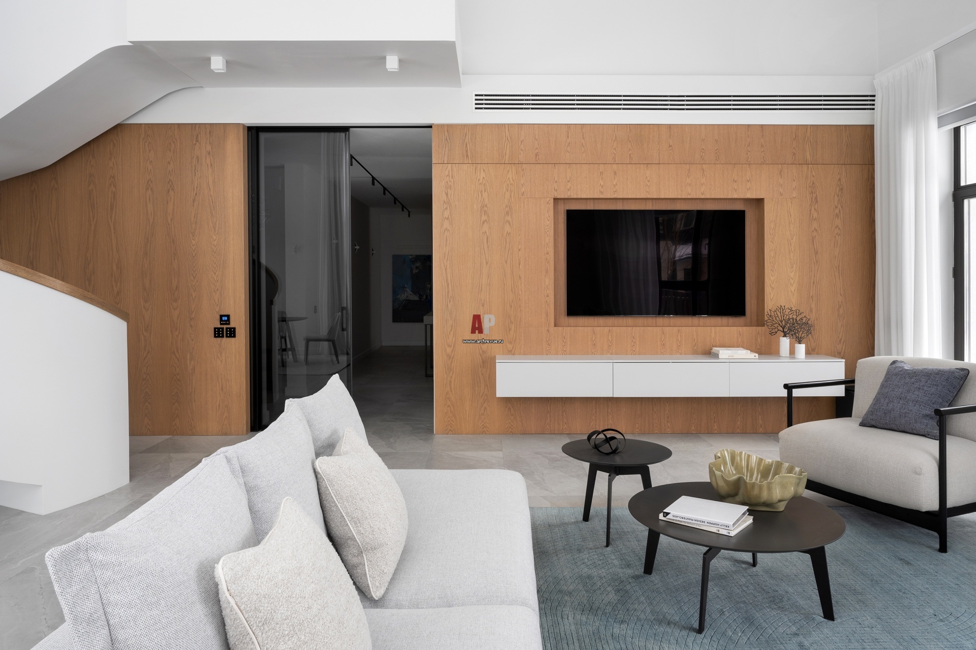 Стена за ТВ в гостиной зашита панелями из шпонированного дуба. Текстура натурального дерева утепляет монохромный интерьер.